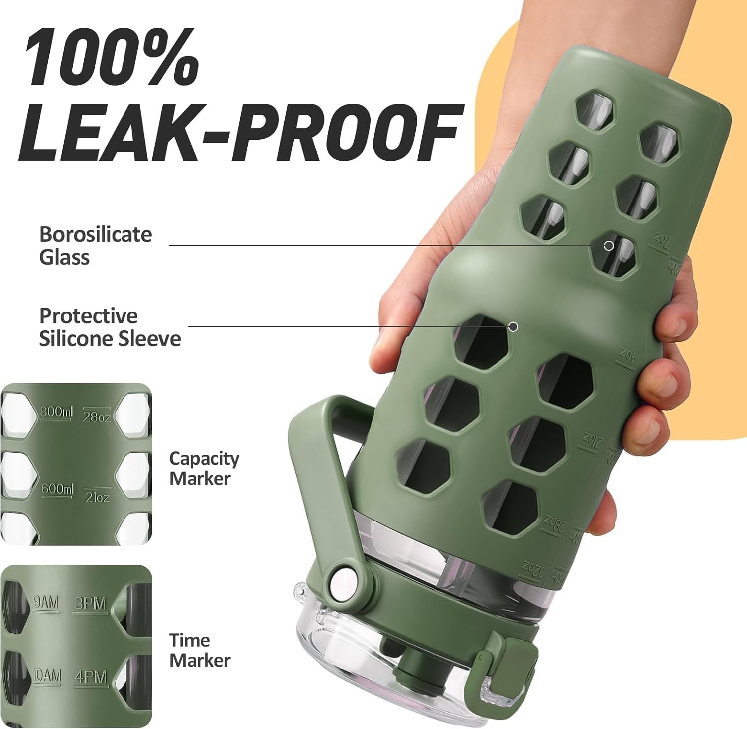 MUKOKO 32 oz Glass Tumbler with Straw,Glass Water Bottles with Time Marker,Iced Coffee Cup with Silicone Sleeve,Motivational Drinking Bottles,Leakproof-Olive