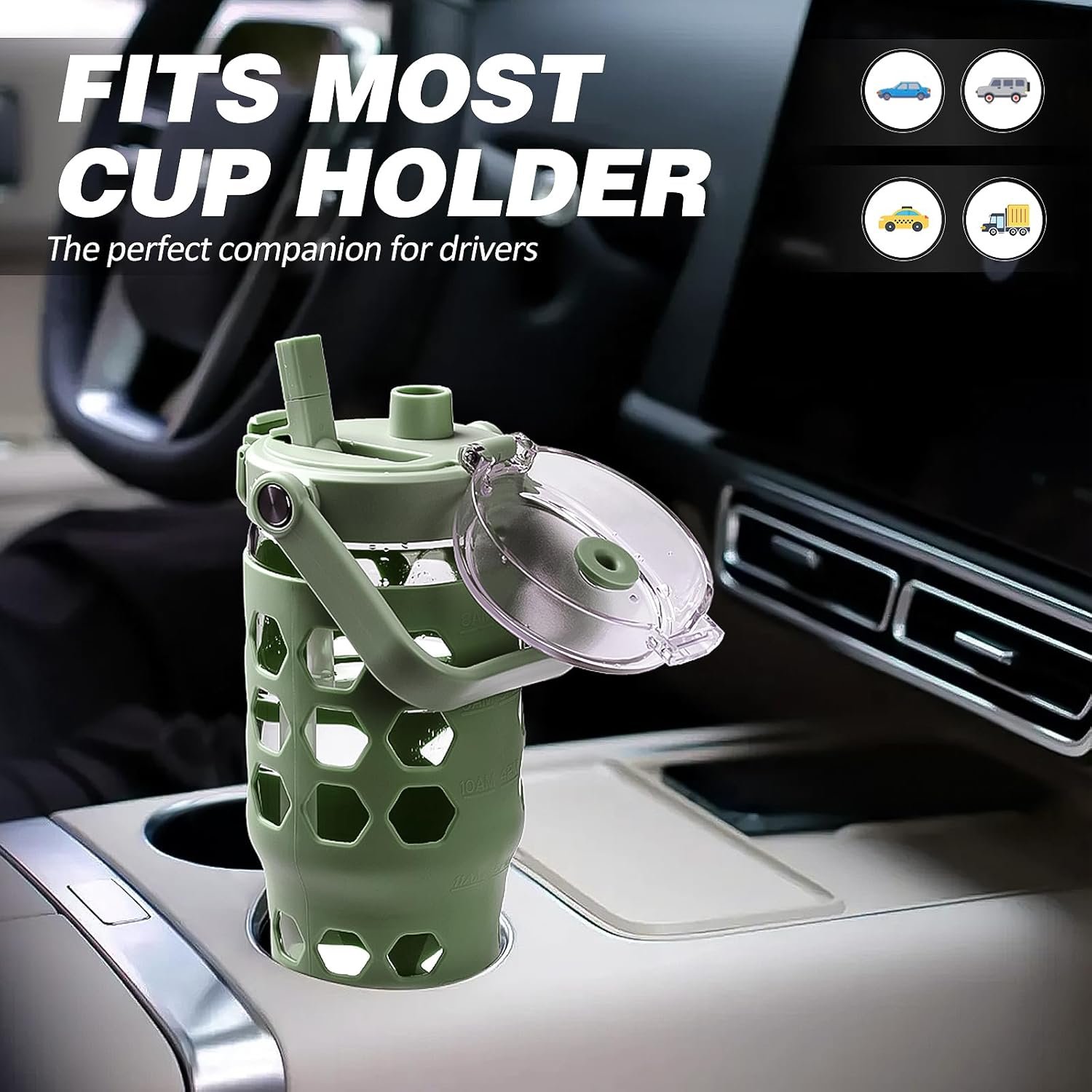 FITS MOST CUP HOLDER:This smoothie cup has a narrow bottom design which make it fits most cup holder in car. The special design makes the tumbler mug perfectly fits all the people.- All mukoko glass water bottles parts are BPA free.