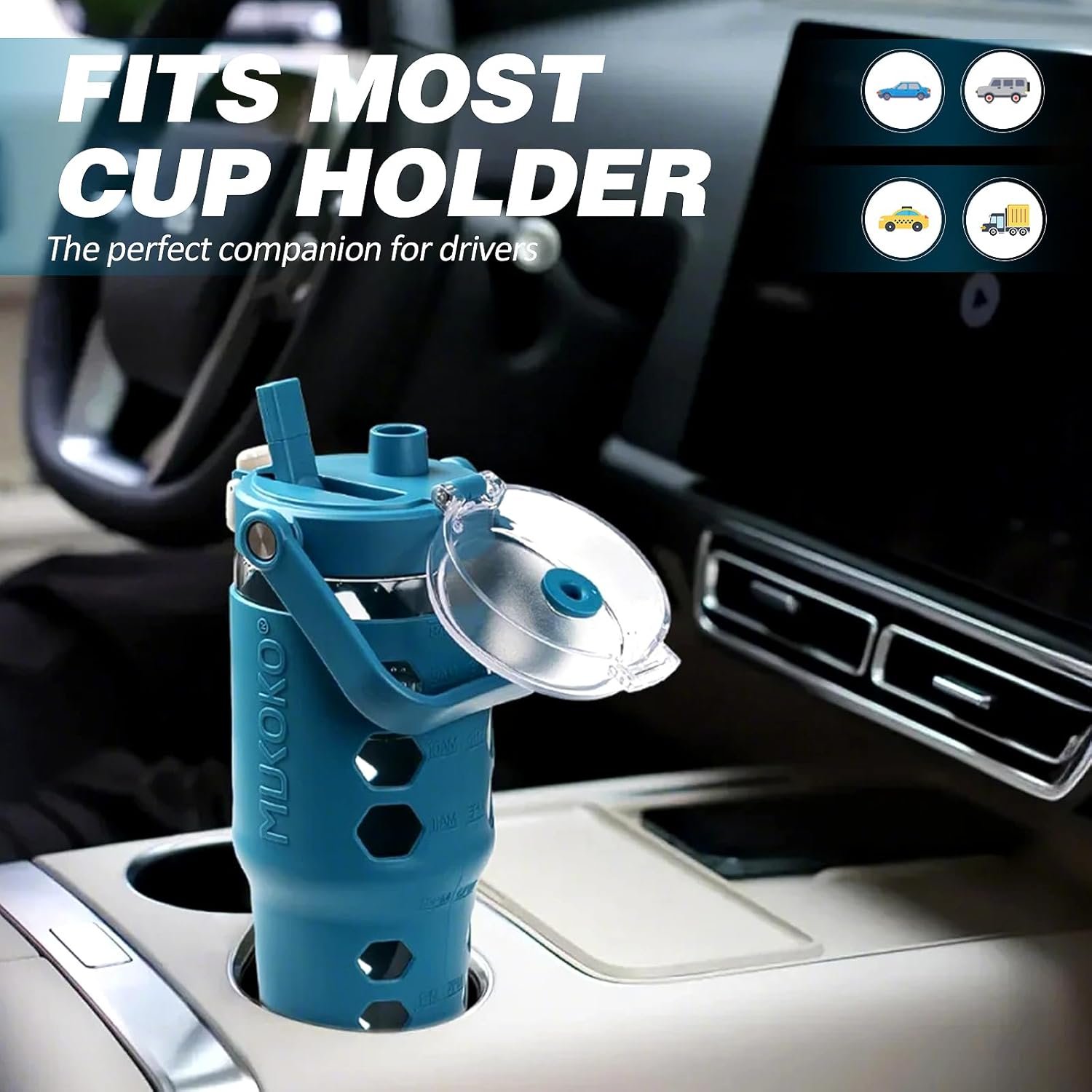 FITS MOST CUP HOLDER:This smoothie cup has a narrow bottom design which make it fits most cup holder in car. The special design makes the tumbler mug perfectly fits all the people.- All mukoko glass water bottles parts are BPA free.
