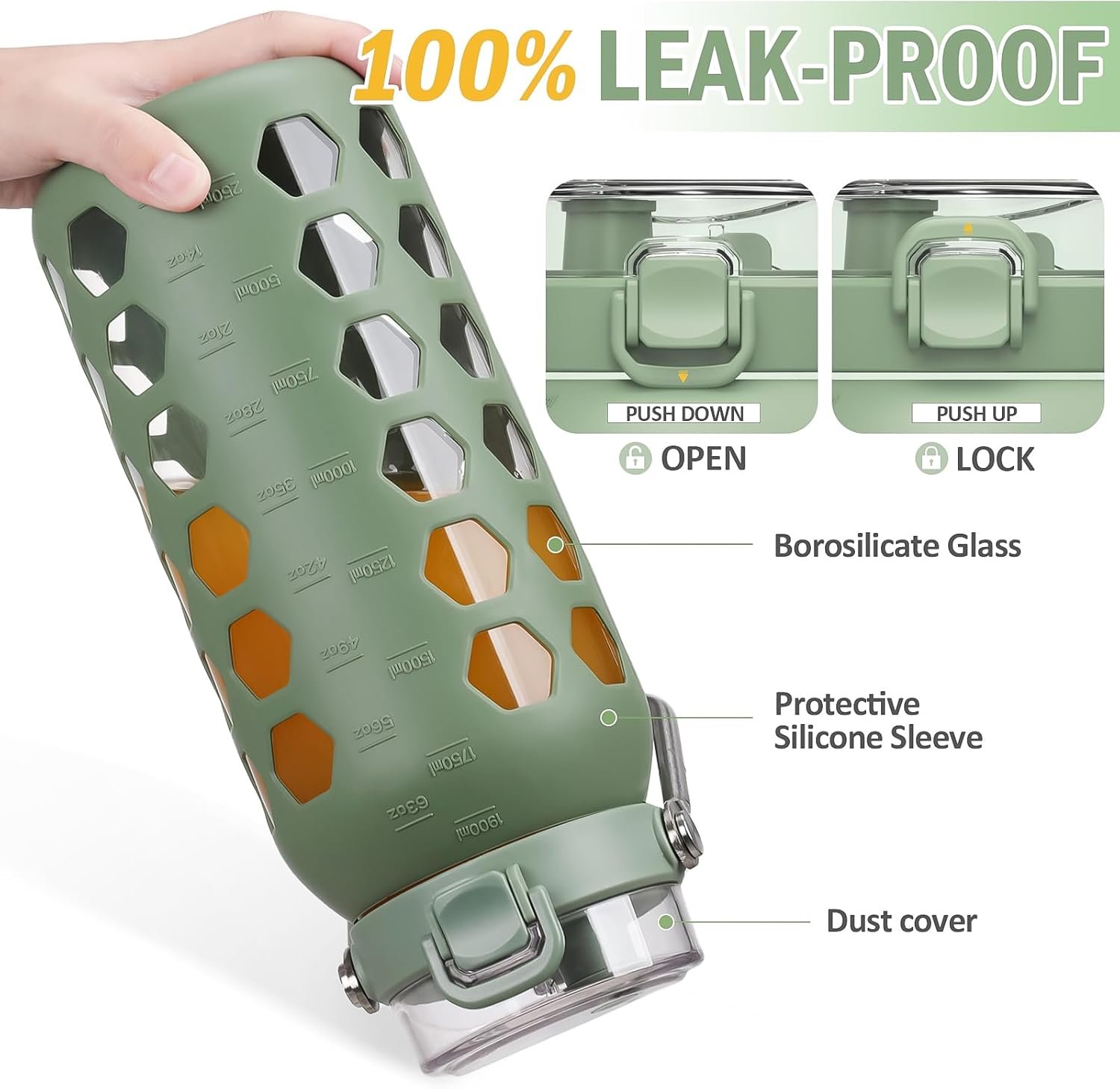 GLASS BOTTLE WITH SILICONE COVER – The water bottle is designed with high-quality silicone cover, which is anti slip, heat insulation, and ice insulation, effectively protecting the inner liner, preventing scalding, wear-resistant, and sturdy.