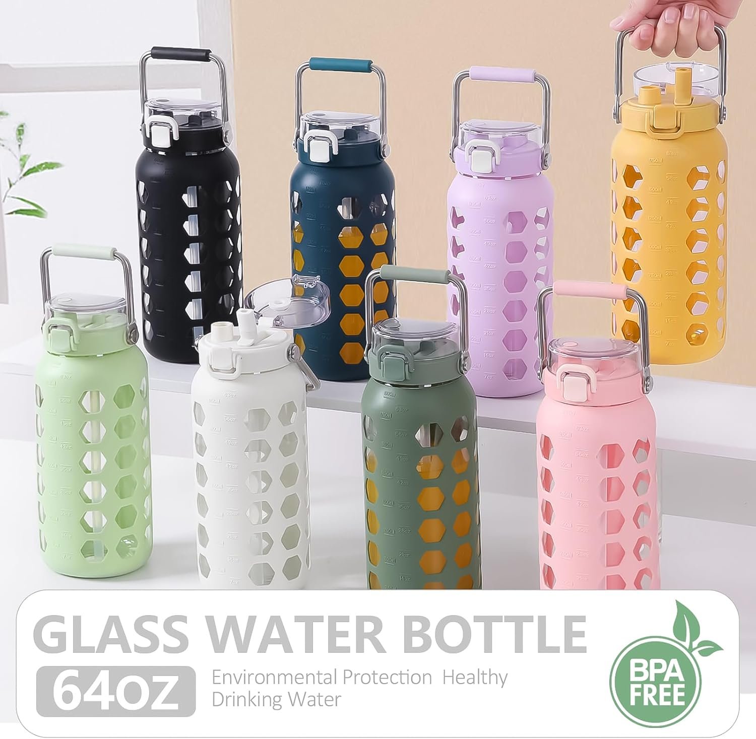 GLASS BOTTLE WITH SILICONE COVER – The 2 liter water bottle is designed with high-quality silicone cover, which is anti slip, heat insulation, and ice insulation, effectively protecting the inner liner, preventing scalding, wear-resistant, and sturdy.