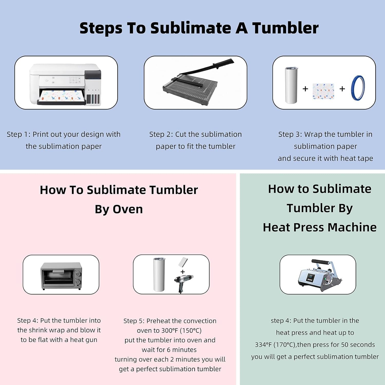 SUBLIMATION TIPS:If you choose a heat press machine,recommend time is 50 seconds and temperature is 334°F.If you choose an oven,recommend time is 6 minutes and temperature is 300°F.Attention:Both best done with sublimation shrink wrap.