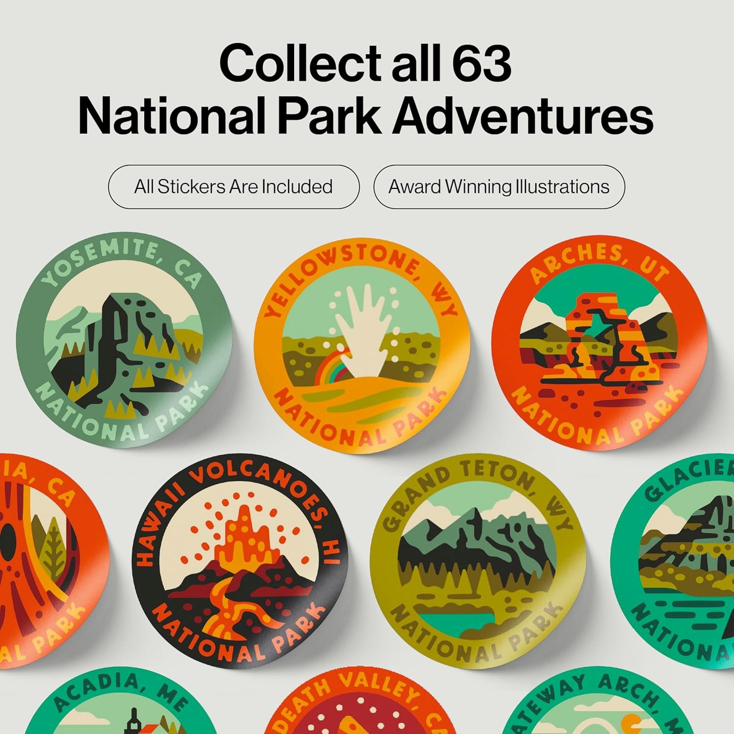 63 NATIONAL PARK STICKERS: Keep track and show off all your National Parks of the USA memories with the colorful included water proof stickers