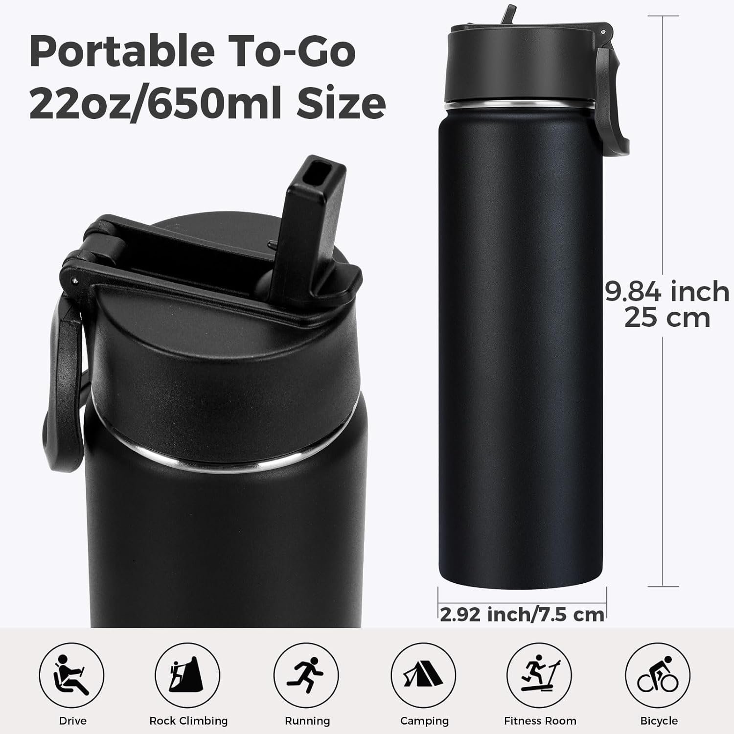 【Sleek & Durable Design】Featuring a scratch-resistant, powder-coated exterior, this bottle offers a secure grip and fade-proof colors. Its slim profile fits most cup holders and backpacks—ideal for gym, camping , work, or daily commutes