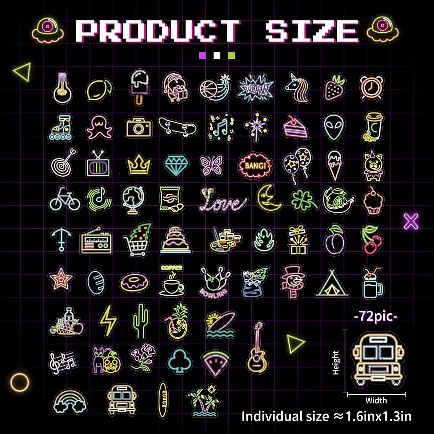 Neon Water Bottle Stickers for Kids, 72 PCS Vinyl Art Waterproof Stickers Pack for Laptop Skateboard Phone Case, Cute Colorful Neon Sticker for Teens