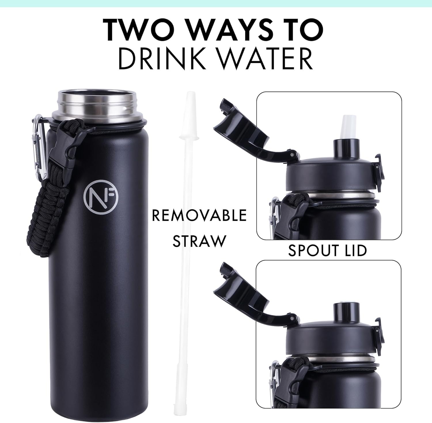Newfad 32 oz Insulated Water Bottle With Detachable Straw & Paracord Handle, Stainless Steel Thermos Water Bottle with Leakproof Lockable Lid, BPA-Free Sports Bottle (Black)