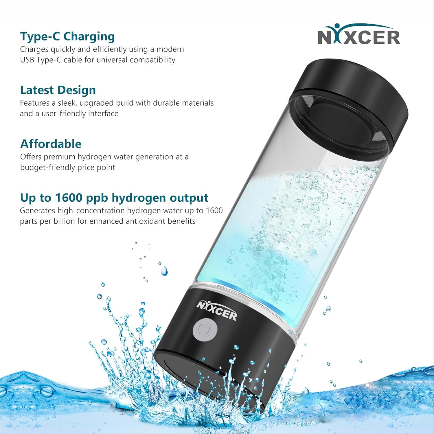 Nixcer Hydrogen Water Bottle Generator – 3 Min SPE PEM Tech, 2025 Model, 420ML Portable Hydro Water Bottle Machine for Travel, Wellness & Recovery, Ideal for Kids, Men & Women (Black)