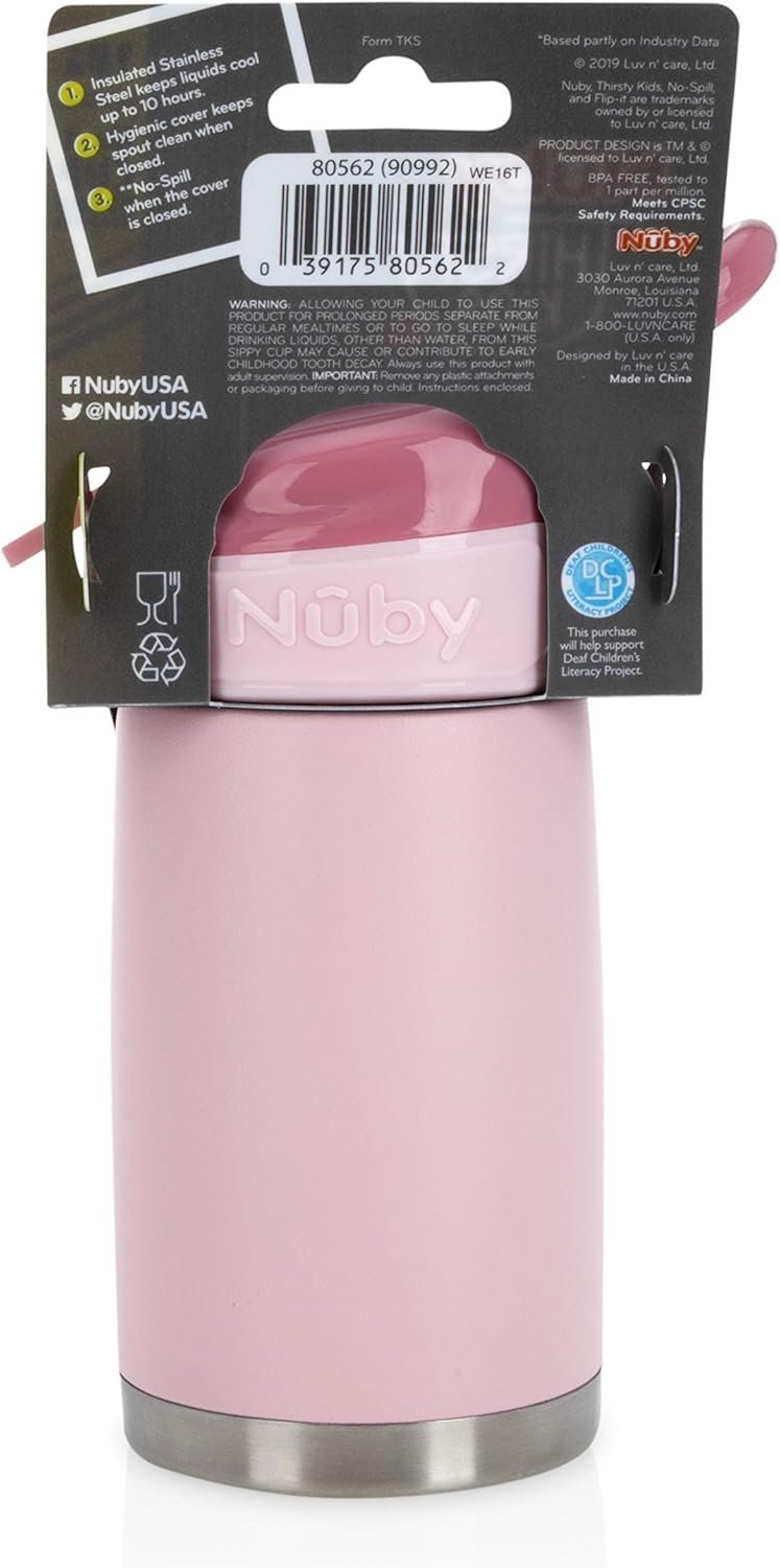 We want your little one to stay hydrated, so we designed the perfect stainless steel sippy cup for your family. Nuby’s Thirsty Kids No-Spill Flip-It Reflex Stainless Steel Travel Cup has all the features needed in a cup for kids on the go. This tippy cup has a soft silicone soft spout that is designed to be gentle on gums and teeth. The cup’s top closes securely to help prevent drips and spills and keep the spout protected when the cover is closed. Our toddler cup is leak-resistant and holds up to 10 ounces (300 ml) of liquid—perfect for staying hydrated! This stainless steel toddler water bottle is made of 304 food-grade stainless steel that helps protect furniture from a “sweating” cup and keeps liquid cool for up to 10 hours, making it a back to school essential! All Nuby products are made of safe, durable materials and exceed all government safety regulations.