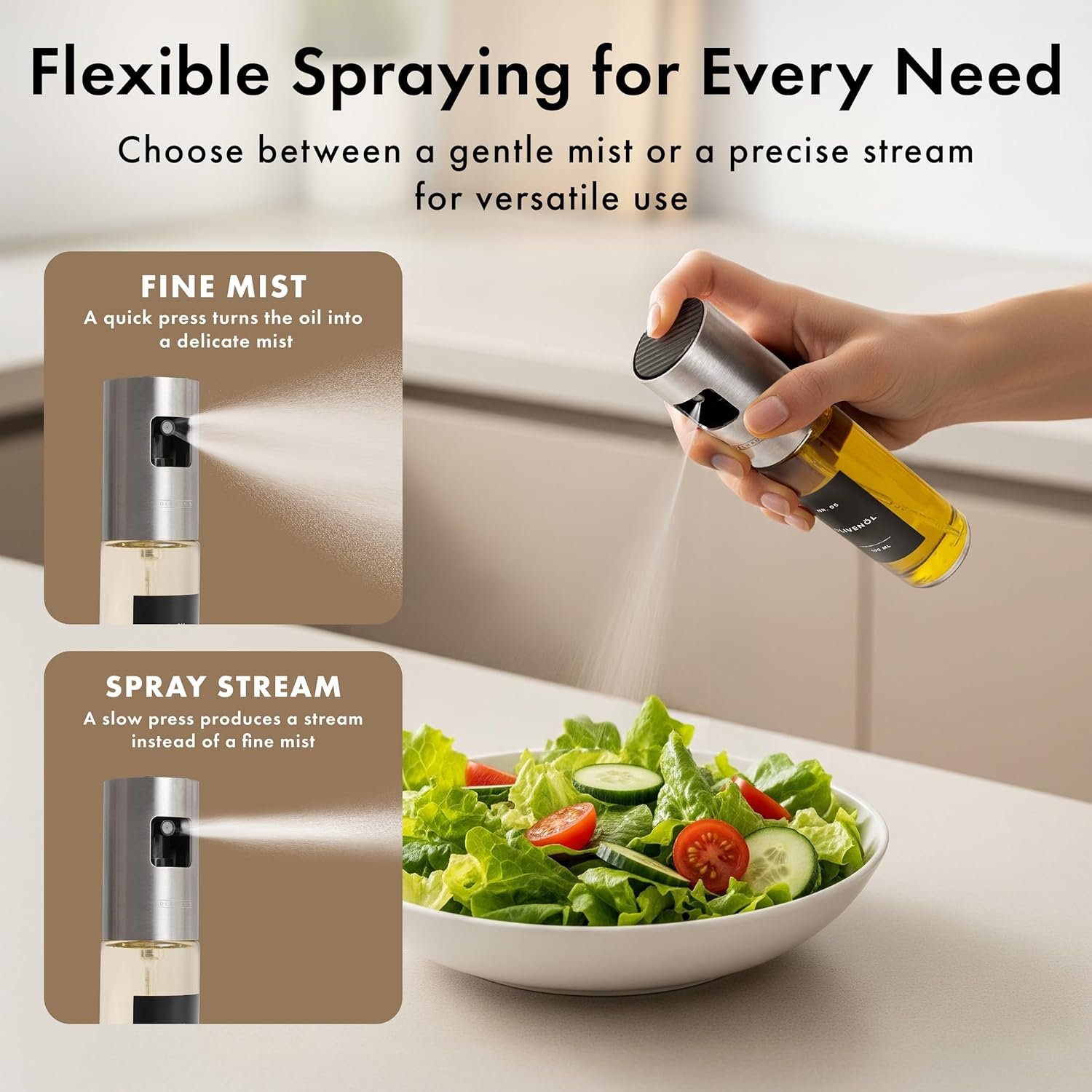 SUITABLE FOR EVERY OIL & ANY KITCHEN: The oil sprayer is ideal for olive oil, sunflower oil, vinegar, soy sauce, water & more. Perfect for cooking, grilling, baking, roasting & salads. Also usable as an oil dispenser.
