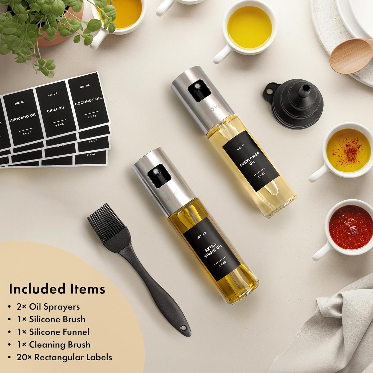 20 PRE-PRINTED LABELS INCLUDED: Staying organized made easy. The set includes 20 pre-printed labels with popular names like “Olive Oil,” “Vinegar,” “Soy Sauce,” and more. For clear identification and quick access.