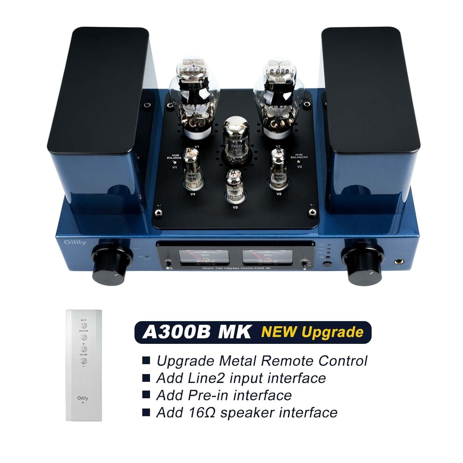 Oilily A300B MK Tube Amplifier (8W/CH, 20Hz–25KHz) — perfect for turntables, direct RCA line input for built-in phono preamp models, external preamp required for others to match its 350mV line-level sensitivity.