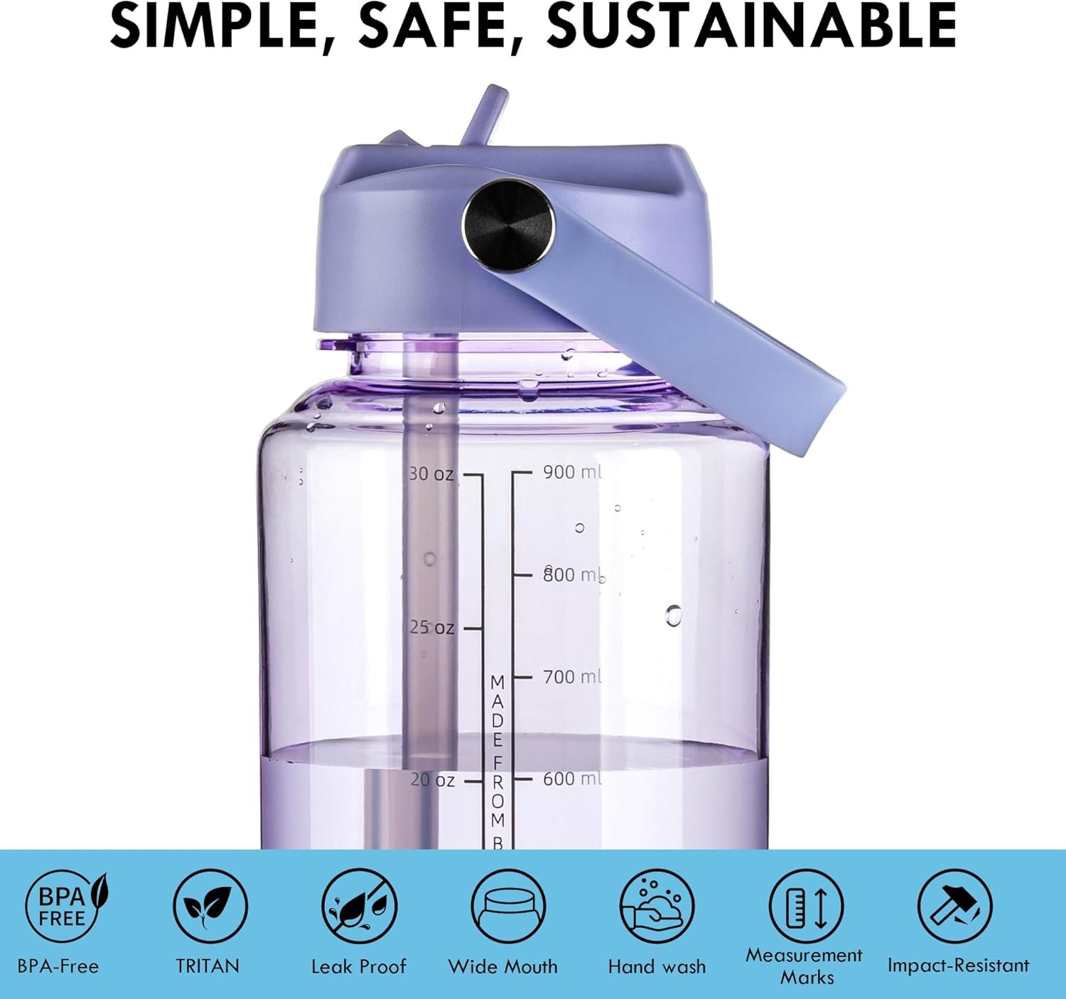OLDLEY 32 oz Clear Water Bottle with Straw,Tritan BPA-Free, Wide Mouth, Leak Proof – for Gym, Travel, Home, School, Office (Purple)