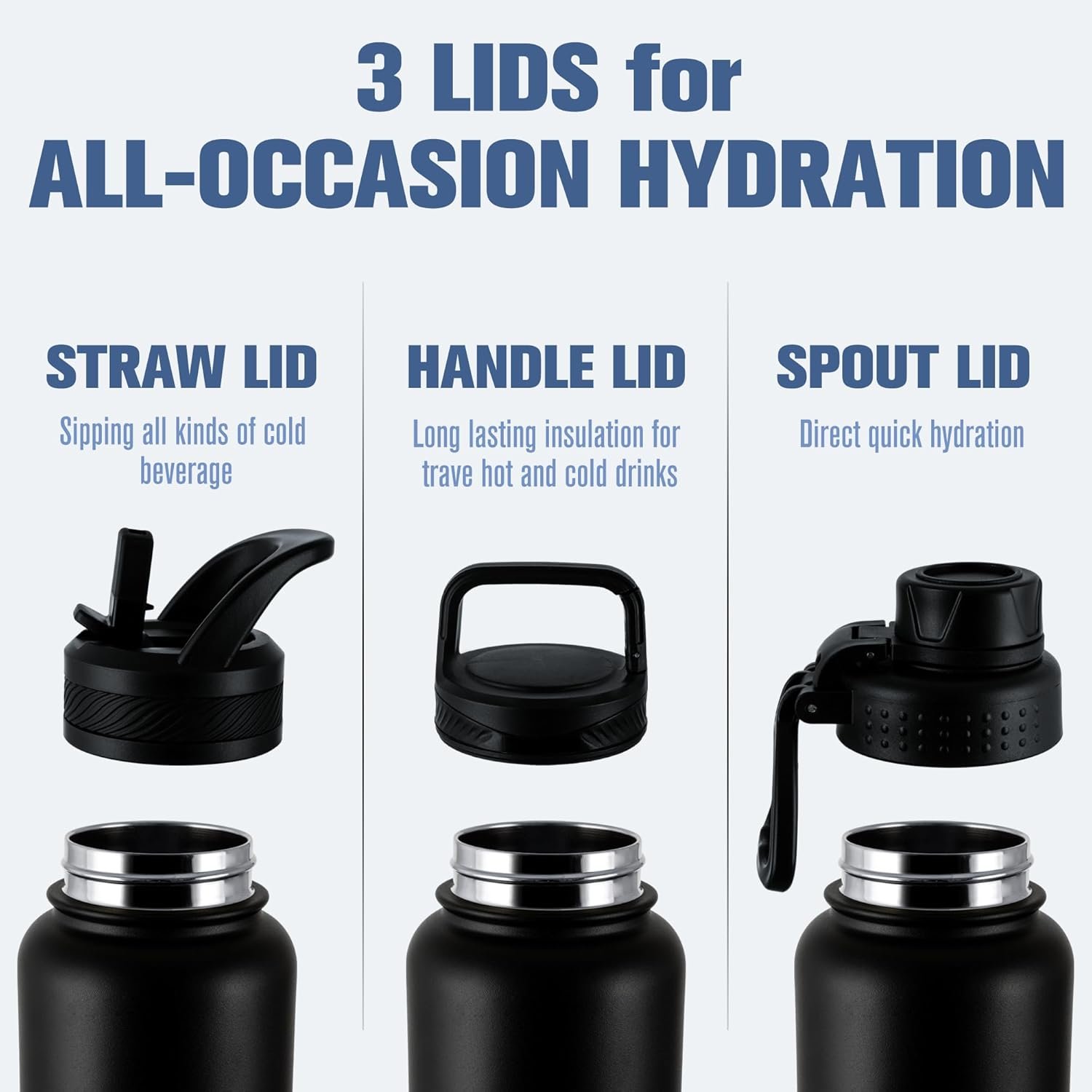 3 LIDS: YES, the OLDLEY comes with THREE different 100% LEAK PROOF lids. These 3 caps are designed for convenient drinking on-the-go, with a wide-mouth opening for quick ice filling and cleaning. The handle lid simplifies beach and camping adventures, while the straw lid suits cycling and gym sessions. Plus, the spout cover is perfect for hiking and hunting.