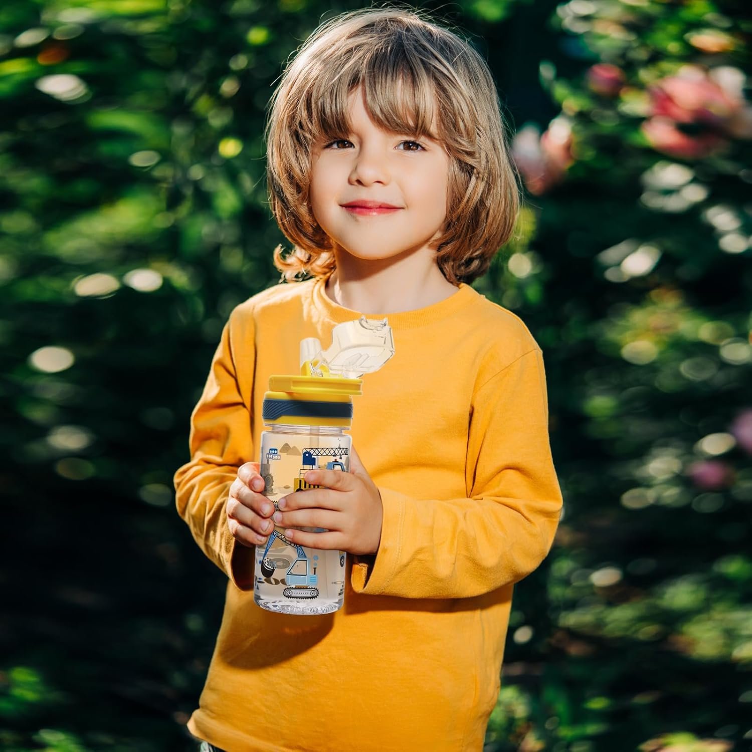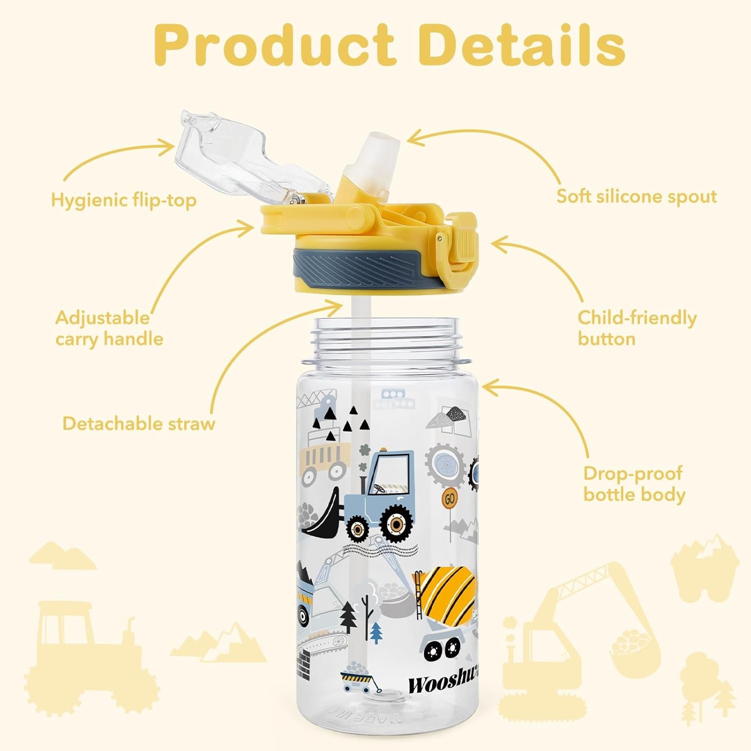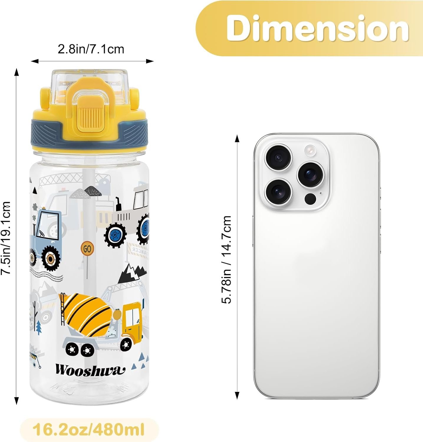 omedecal Kids Water Bottle for School, 16 Oz Plastic Straw Water Bottle with Silicone Spout and Leakproof Cover, Dishwasher Safe (Excavator)