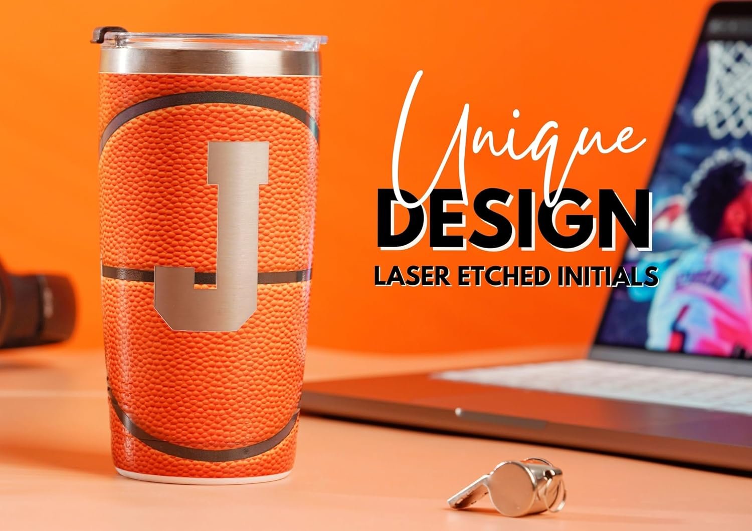 Personalized Basketball Gifts for Teen Boys, Men, Coaches, 20oz Stainless Steel Tumbler with Laser Etched Initials for Basketball Players, Lovers, Orange – S