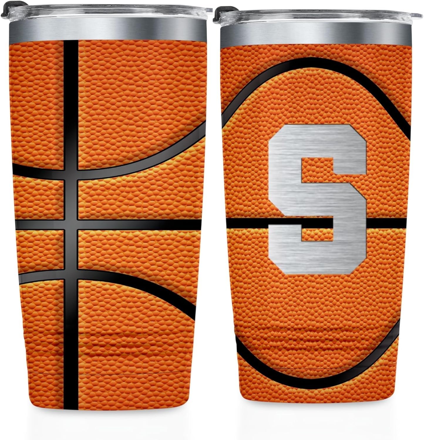 Onebttl Personalized Basketball Gifts for Teen Boys, Men, Coaches, 20oz Stainless Steel Tumbler with Laser Etched Initials for Basketball Players, Lovers, Orange – S