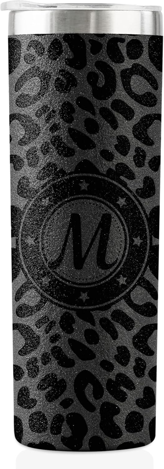 Onebttl Personalized Leopard Cup with Initial – Unique Cool Gifts for Women Who Have Everything on Birthday, Christmas – 20 oz Double-Wall Vacuum Tumbler with Lid and Straw – Black Glitter – Letter M