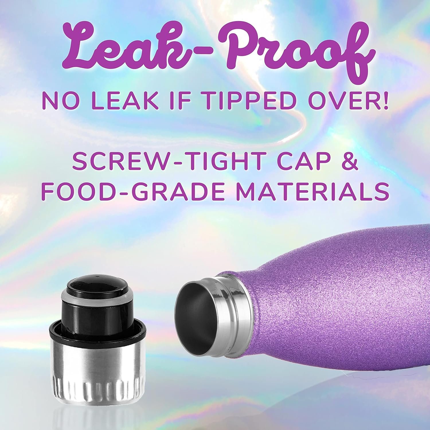 Made for Little Hands: Our stainless steel water bottles hold up to 17 ounces of liquid, but the shape makes the large-capacity bottles easy to grasp for little hands. The ridged cap allows little girls to open it with just a single twist! There are no leaks if the bottle is tipped over!