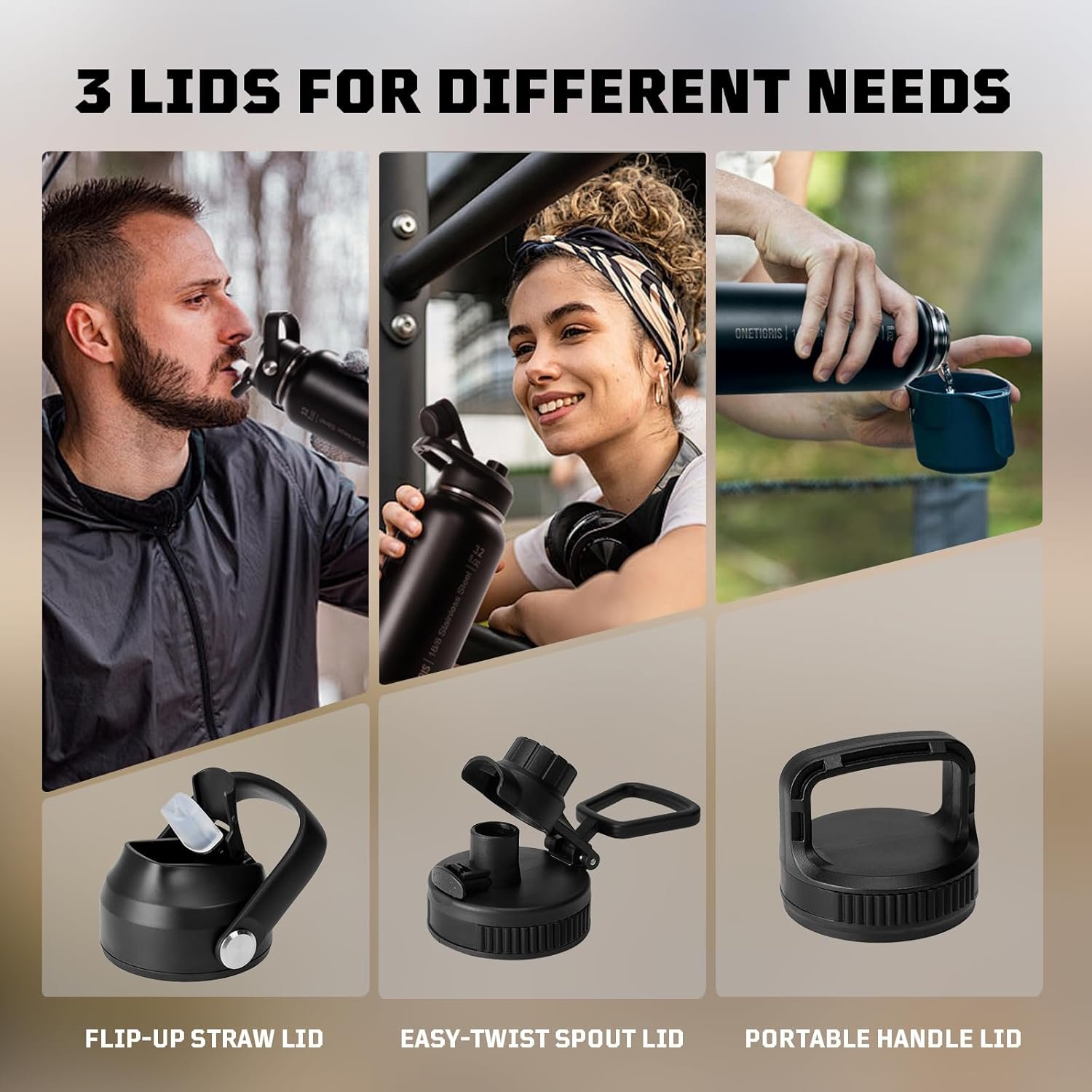 3 Interchangeable Lids: The insulated water bottle comes with three different lids, catering to various beverage needs throughout your day. Easily switch between the three lids anytime, anywhere, enhancing your drinking experience