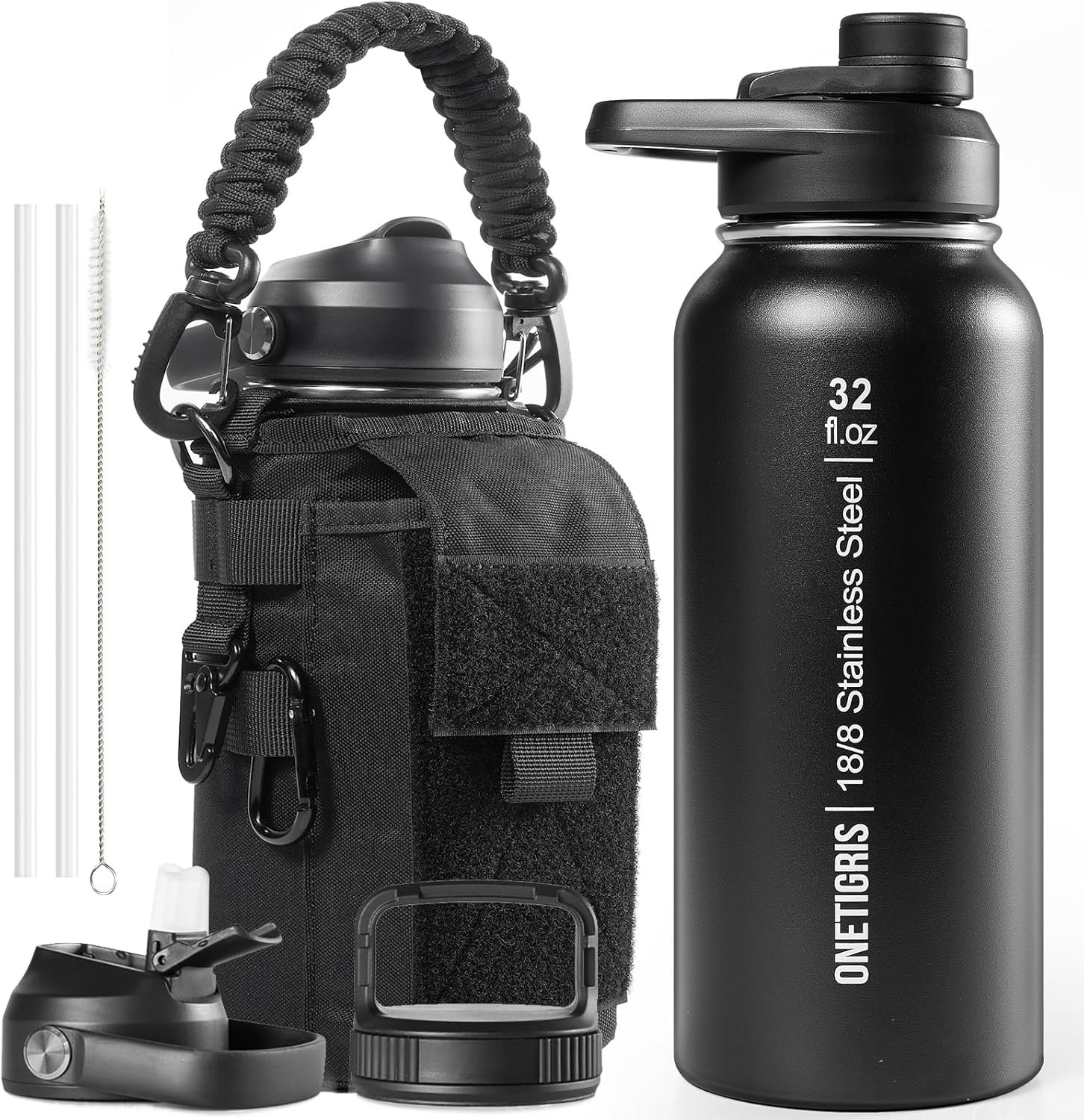 ONETIGRIS 32 oz Insulated Water Bottle with Straw – Tactical Stainless Steel Water Jug, Leakproof Thermos Wide Mouth Sport bottle with 3 Lids and Sleeve for Travel, Gym, Camping, Hiking