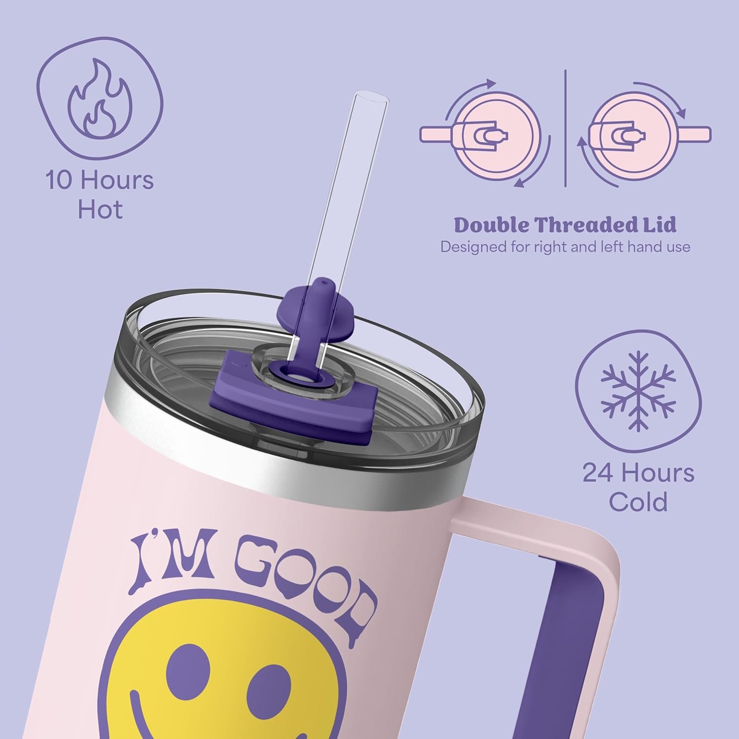 LEFT- AND RIGHT-HAND FRIENDLY DESIGN: Equipped with a double-threaded Tritan lid, making it easy to use for everyone. This insulated tumbler with handle is BPA-free, durable, and built for long-lasting performance.
