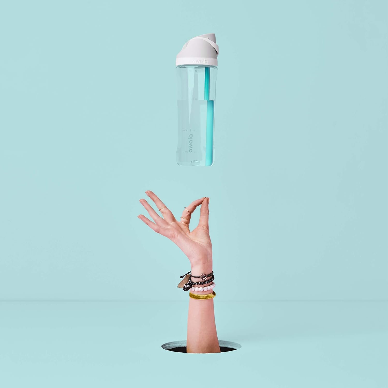 The Owala FreeSip Tritan Water Bottle with Locking Push-Button Lid easily tackles every thirst. With a built-in, easy-clean straw and a wide-mouth opening, the FreeSip reusable bottle is designed for drinking two different ways: sipping upright through the straw or tilting back to swig from the wide-mouth spout opening. Add in a push-to-open lid and playful colors, and staying hydrated has never been simpler—or more fun. Additional features include a carry loop that doubles as a lock, a cup holder-friendly base, and a wide opening for easy cleaning and adding ice. The Owala FreeSip Tritan Water Bottle with Locking Push-Button Lid has a capacity of 25 ounces. Made from BPA- and phthalate-free, stain and odor-resistant durable Eastman Tritan plastic. Top-rack dishwasher safe. Manufacturer’s limited lifetime warranty.