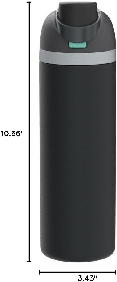 The Owala FreeSip Insulated Stainless-Steel Water Bottle with Locking Push-Button Lid easily tackles every thirst. With a built-in, easy-clean straw and a wide-mouth opening, the FreeSip reusable bottle is designed for drinking two different ways: sipping upright through the straw or tilting back to swig from the wide-mouth spout opening. Add in a push-to-open lid and playful colors, and staying hydrated has never been simpler—or more fun. Additional features include double-wall insulated stainless steel that keeps drinks cold up to 24 hours, a carry loop that doubles as a lock, and a wide opening for easy cleaning and adding ice. The Owala FreeSip Insulated Stainless-Steel Water Bottle with Locking Push-Button Lid is available in three sizes: 24-Ounce, 32-Ounce, and 40-Ounce. Lid is dishwasher safe; hand wash cup. Not for use with hot liquids. Manufacturer’s limited lifetime warranty.
