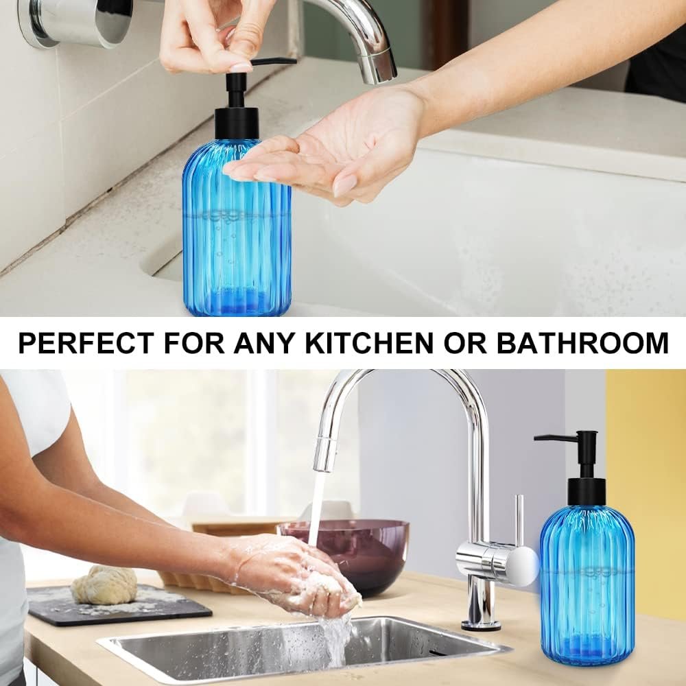Pack of 2 Glass Soap Dispenser with Black Pump, 400 ml Refillable Pump Dispenser for Kitchen, Bathroom, Order, Laundry Room, Liquid Glass Bottle for Washing Up Liquid, Shampoo, Conditioner (Blue)