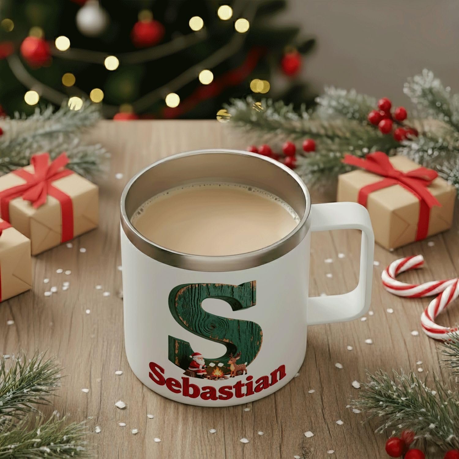 Unique & Heartfelt Personalization: Make every sip special with a truly custom gift! Each mug features a prominent rustic initial letter [e.g., A] enclosing a cozy scene of Santa, a reindeer, and a campfire, with a personalized name [e.g., Ava] printed below, creating a thoughtful and unforgettable present for any loved one.