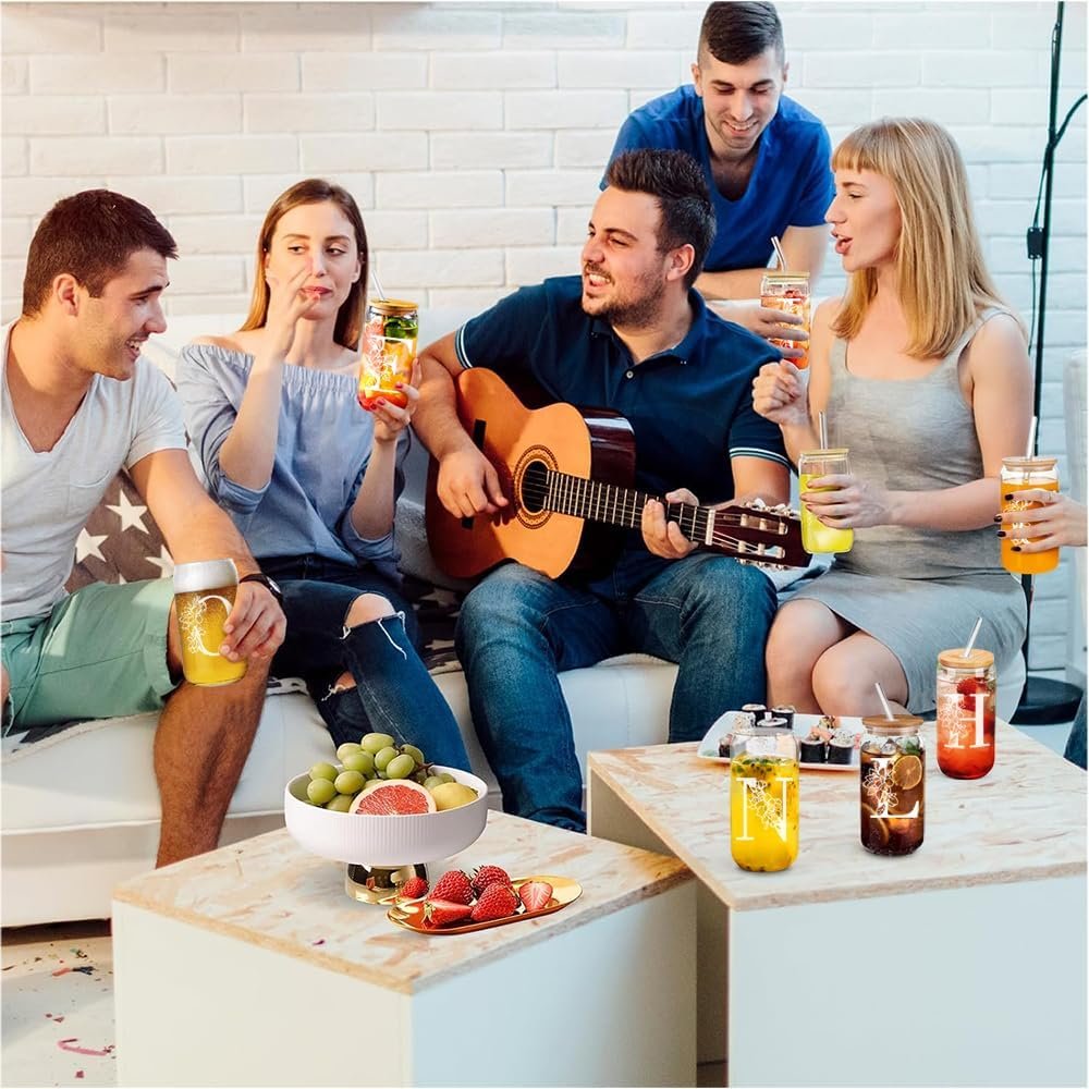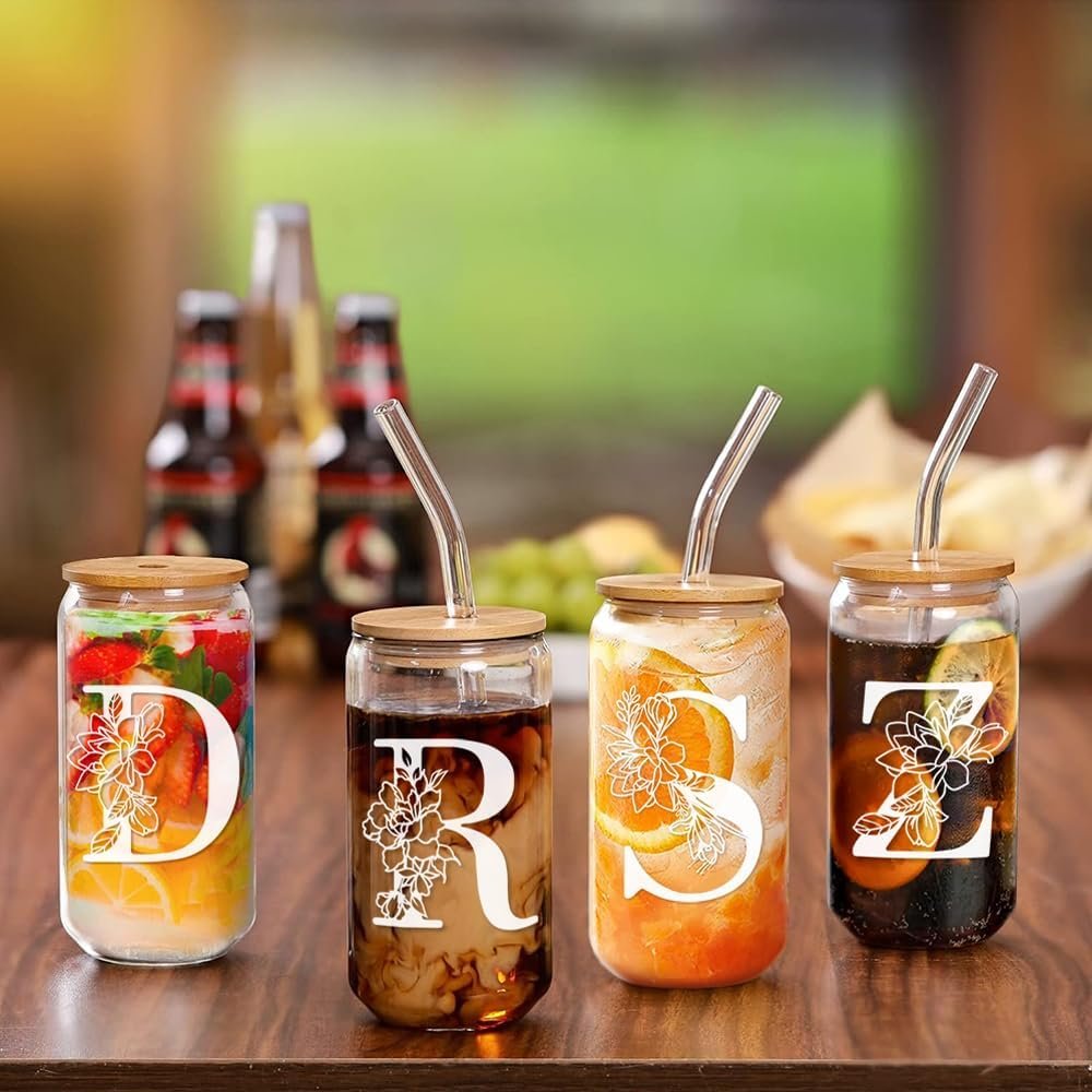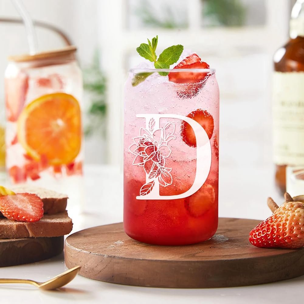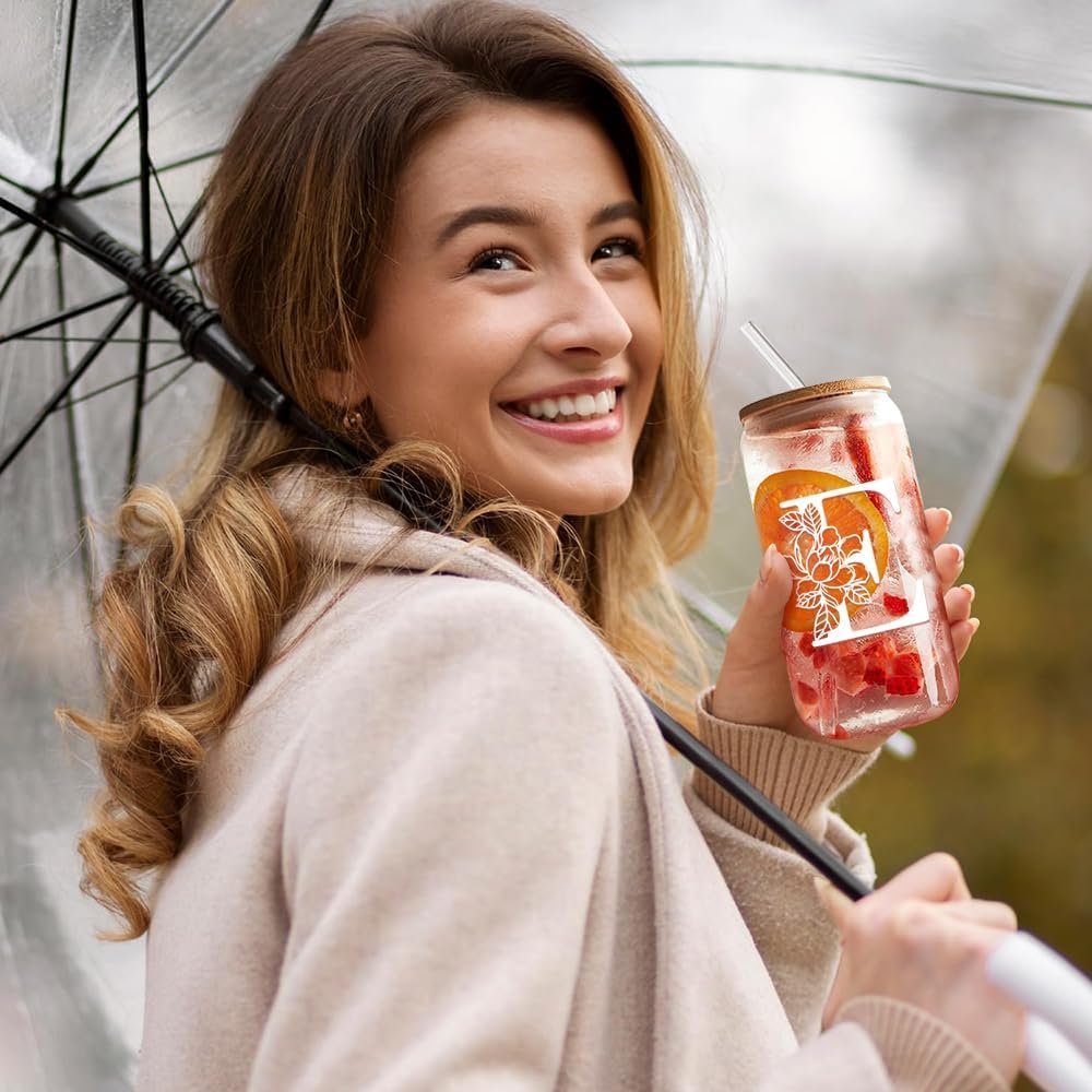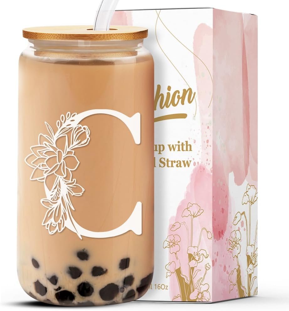 Personalized Glass Cup Women, Stylish 16 oz Glass Cups with Lids Straws, Perfect for Iced Coffee, Smoothies, Christmas gift/Birthday Gifts for Teacher/Nurse/Mom/Sister/Aunt Letter C