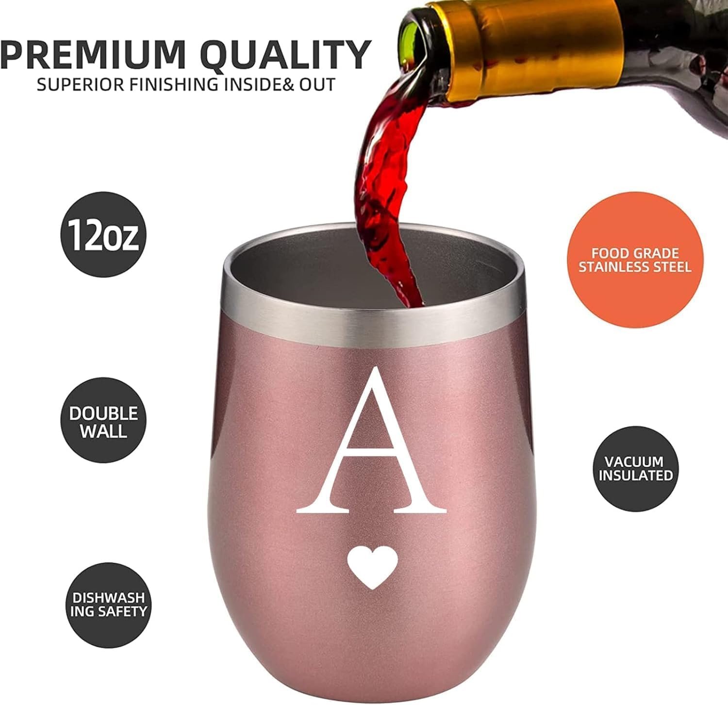Personalized Initial Gifts 12 Ounces Stainless Steel Wine Tumbler with Straw Brush Rose Gold Insulted Mug Wedding Bridesmaid Birthday Graduation Gift for Men Women Monogrammed Gift (A)