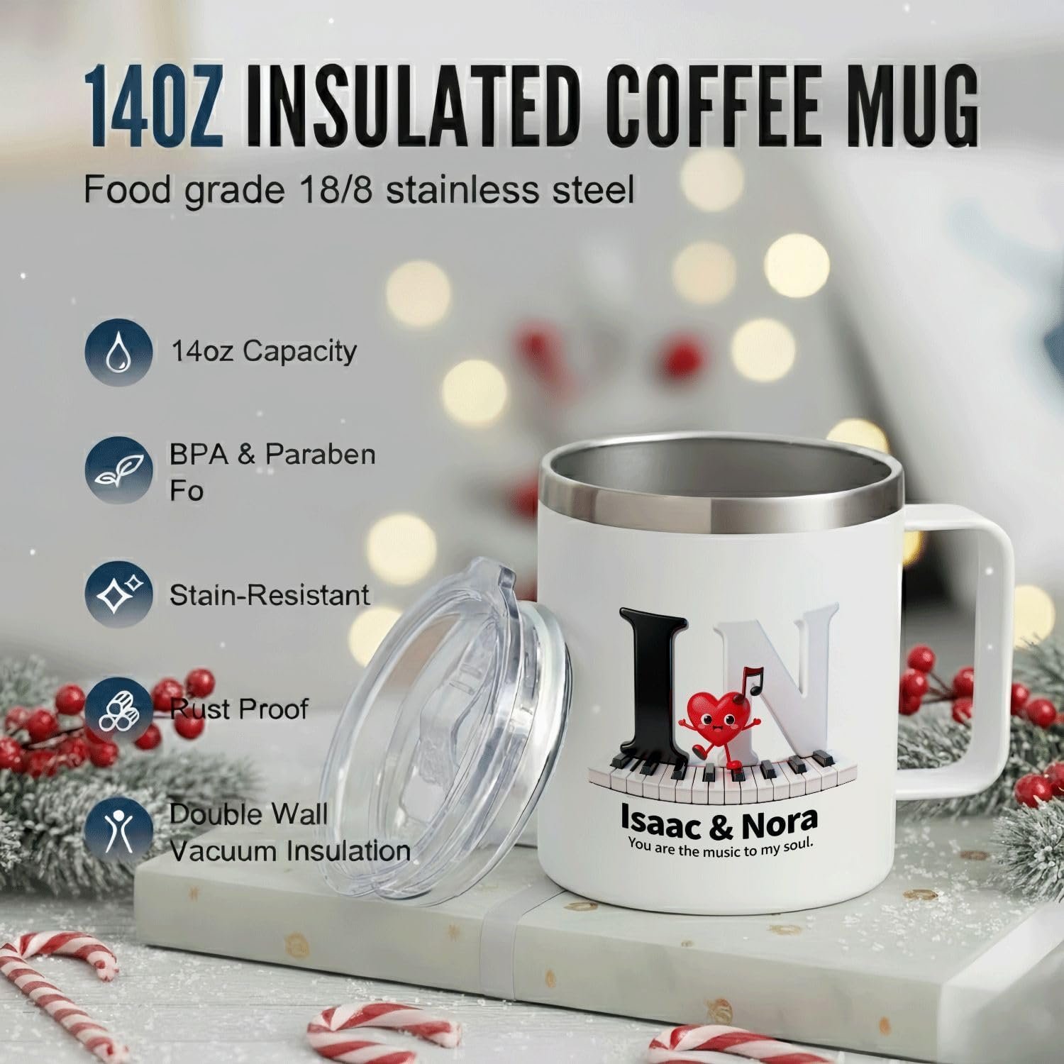 Harmonize Your Love with Our “You Are The Music To My Soul” Personalized Piano Mug! Strike the right chord with a gift that truly resonates with your special someone! Our premium insulated coffee mug isn’t just a stylish drinkware item; it’s a personalized melody of affection, blending the beauty of music with a heartfelt declaration of love. Why This “Music To My Soul” Mug is the Perfect Harmony: Unique Piano Keyboard Personalization: Imagine their delight seeing your chosen initials (like I & N for Isaac & Nora) elegantly integrated onto a classic piano keyboard design, with your custom names printed beneath. This thoughtful, one-of-a-kind design creates a truly memorable moment, perfect for showing how much they mean to you. Heartfelt & Musical Message: The charming phrase “You are the music to my soul” perfectly combines romance with a beautiful musical metaphor. Accompanied by the adorable musical heart character, it’s an instant conversation starter and a constant, loving reminder of your deep connection, resonating with anyone who understands the language of love and music. Superior Insulation for Every Sip: Crafted from high-quality stainless steel, this double-wall insulated tumbler keeps hot beverages warm for hours and cold drinks refreshingly chilled. The comfortable handle makes it easy to hold, and the secure, spill-resistant lid is ideal for daily commutes, creative sessions, or cozy evenings at home. Durable & Versatile for Daily Rhythm: Designed for durability and daily use, this mug is perfect for coffee, tea, hot chocolate, or any favorite beverage. It’s a practical gift that will be cherished and used day after day, bringing a smile with every glance, whether practicing scales or simply enjoying a quiet moment. The Ultimate Romantic & Music Lover’s Gift: Whether it’s for an Anniversary, Valentine’s Day, Christmas, a Birthday, Engagement, or just because, this personalized piano mug is a fantastic way to express affection to your boyfriend, girlfriend, husband, wife, or any special music enthusiast in your life. It’s a gift that composes a symphony of love and joy! Give the gift of warmth, melody, and a truly personal touch. Order your custom “You Are The Music To My Soul” mug today and make their day extra special!