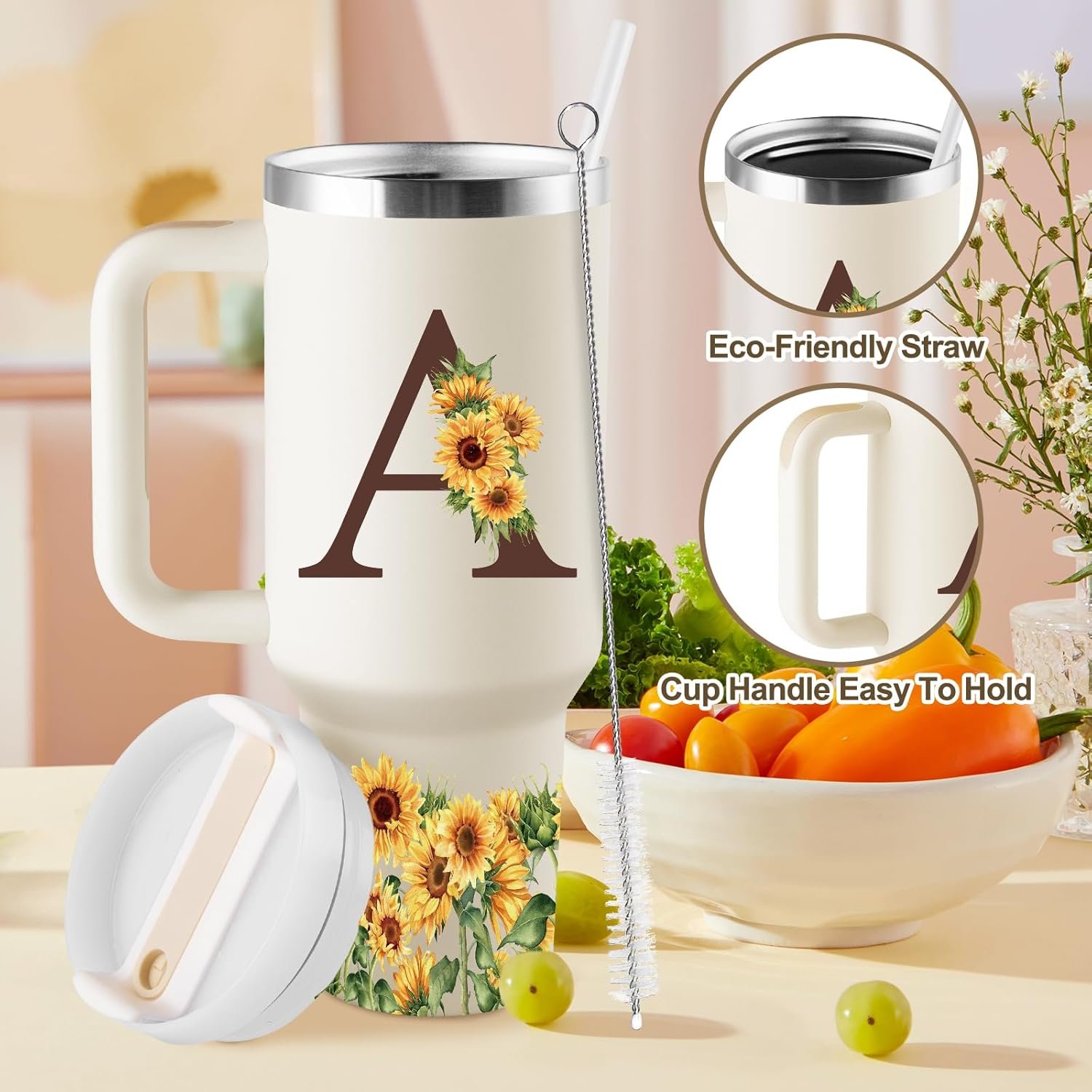 INCLUDES STRAW AND CLEANER BRUSH: We equip it with a straw cleaner brush for easy maintenance. Cleaning is a breeze, making it a hassle-free choice for everyday use. Suitable for sunflower gifts for sunflower lovers, sunflower stuff for women, personalized gifts for her, sunflower mug, monogrammed cup, initial cups, personalized cups for women, initial tumbler for women, sunflower birthday gifts for women, Christmas gifts for women, her, mom, wife, sister, girlfriend, daughter, best friend.