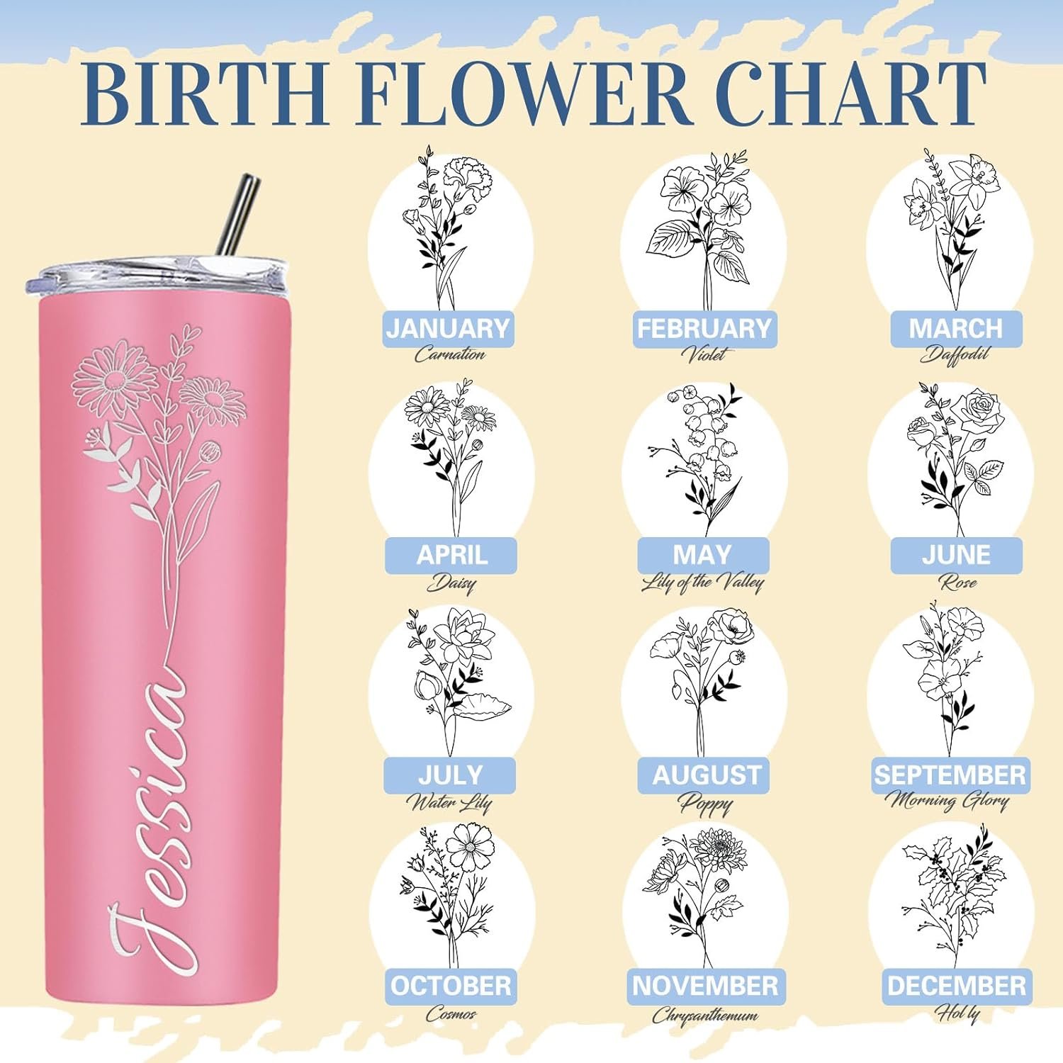 Personalized Tumblers with Name Birth Flower Custom Insulated Tumbler Cup Engraved Customized Birthday Christmas Bridesmaid Gifts for Women Stainless Steel 20 Oz