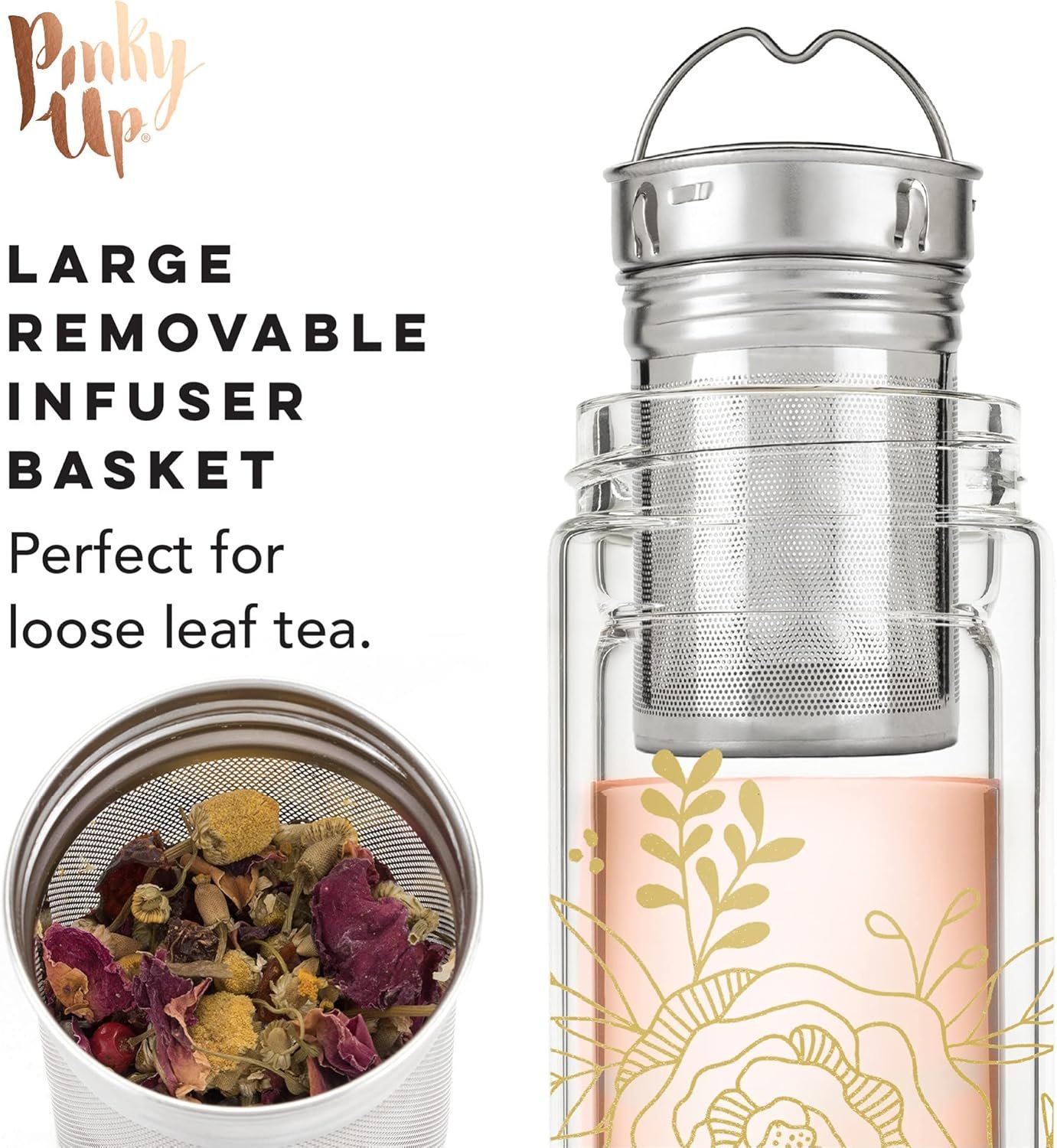 Pinky Up Blair Travel Infuser Mug, Double-Walled Glass, Stainless Steel Strainer, 16 Oz, Bouquet