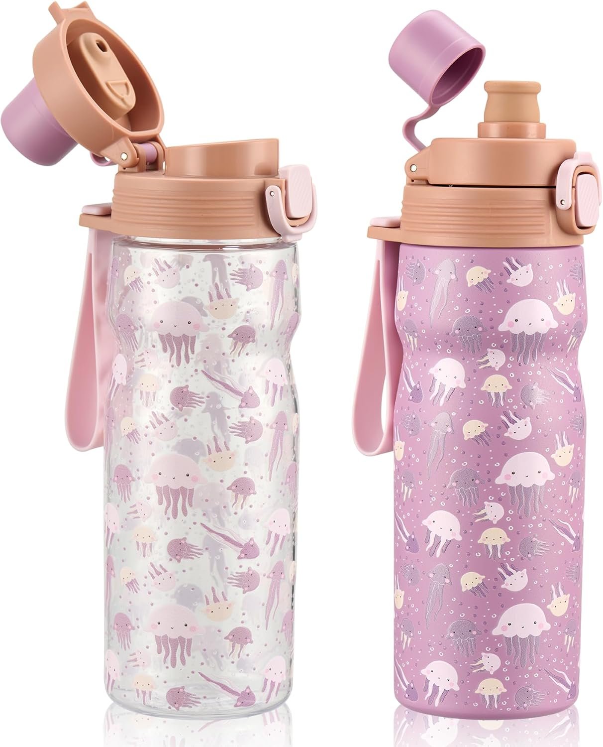 PIQUEBAR Kids insulated Water Bottle 17oz & Sport Water Bottle 24oz Set, Stainless Steel Metal Vacuum Water Bottles, Leakproof Tritan Sport Water Bottles for School Boys Girls, Pink Jellyfish