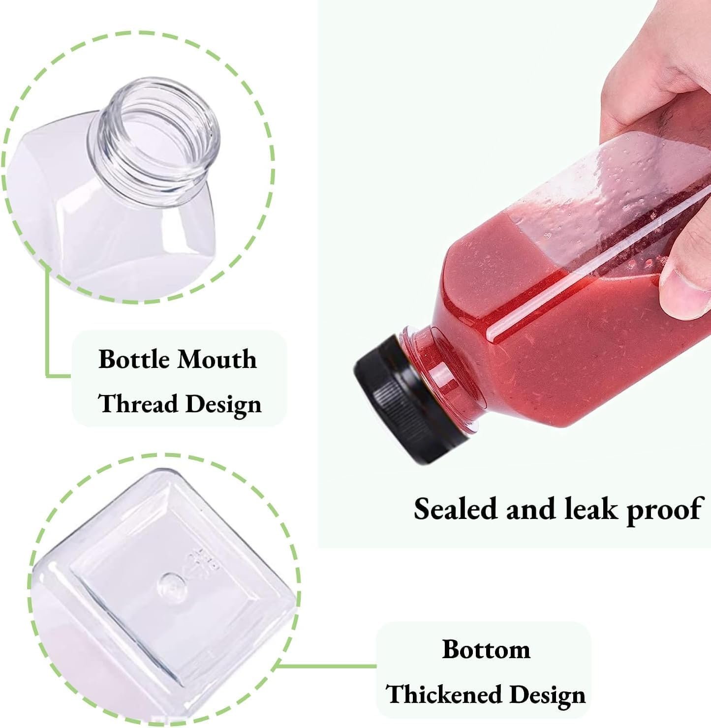 [REUSABLE AND SUSTAINABLE] Food-grade material can make the plastic bottles with caps healthy and environmentally friendly. They can be recycled. By choosing these reusable plastic juice bottles, you contribute to reducing single-use plastic waste.(WARM TIP :Juicing bottles can not be heated in a microwave oven, can not add hot drinks and not dishwasher safe.!!)