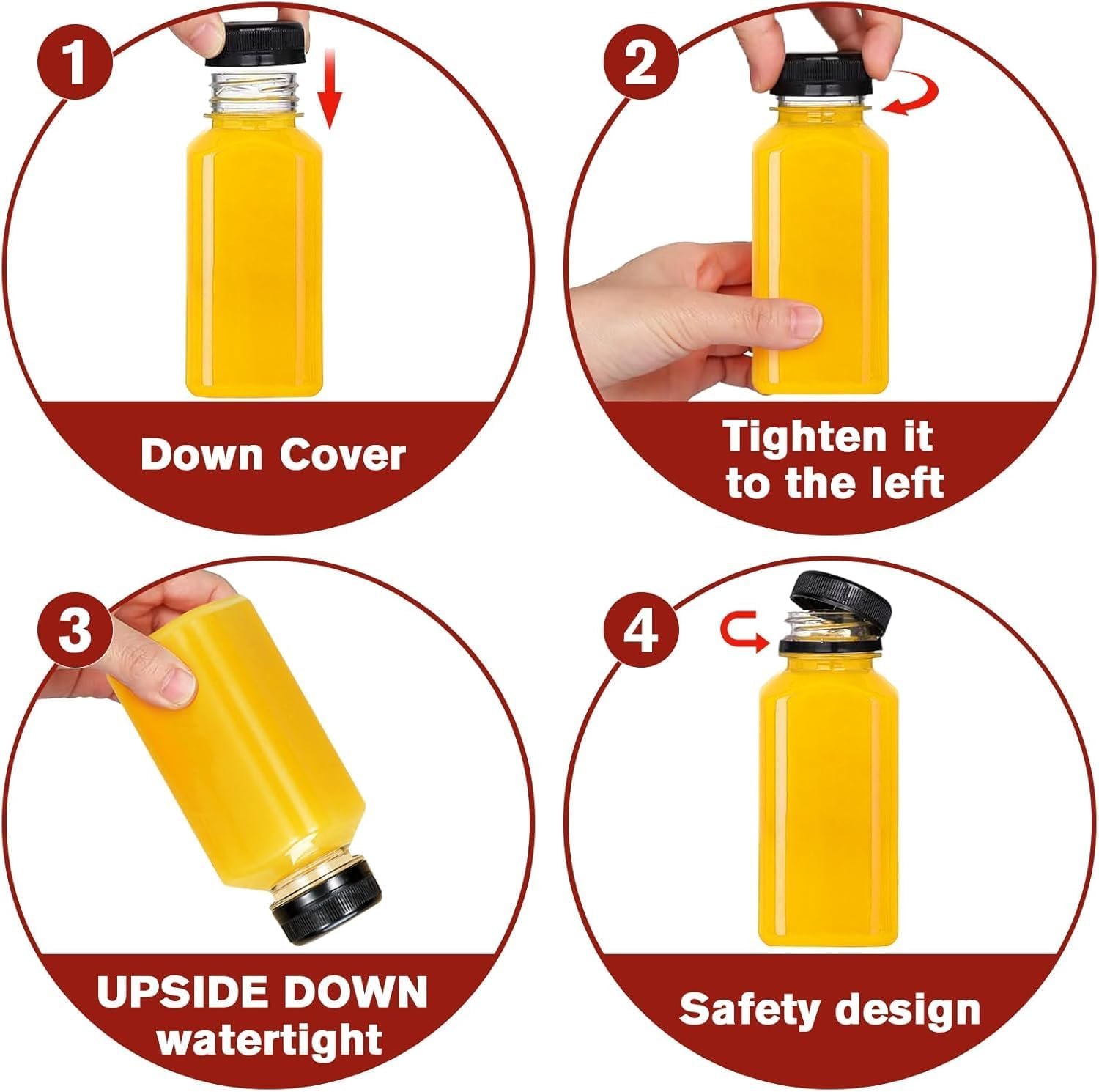 [PREMIUM QUALITY] These juice bottles are thick food grade PET, safe and tasteless, drop resistant and durable. Each bottle is individually wrapped to provide you with a safe and durable juice bottle. Low temperature resistant (-40 to 60℃), freezer safe. Enjoy peace of mind knowing that your juice, milk, coffee, or smoothie is stored in a BPA-free environment.