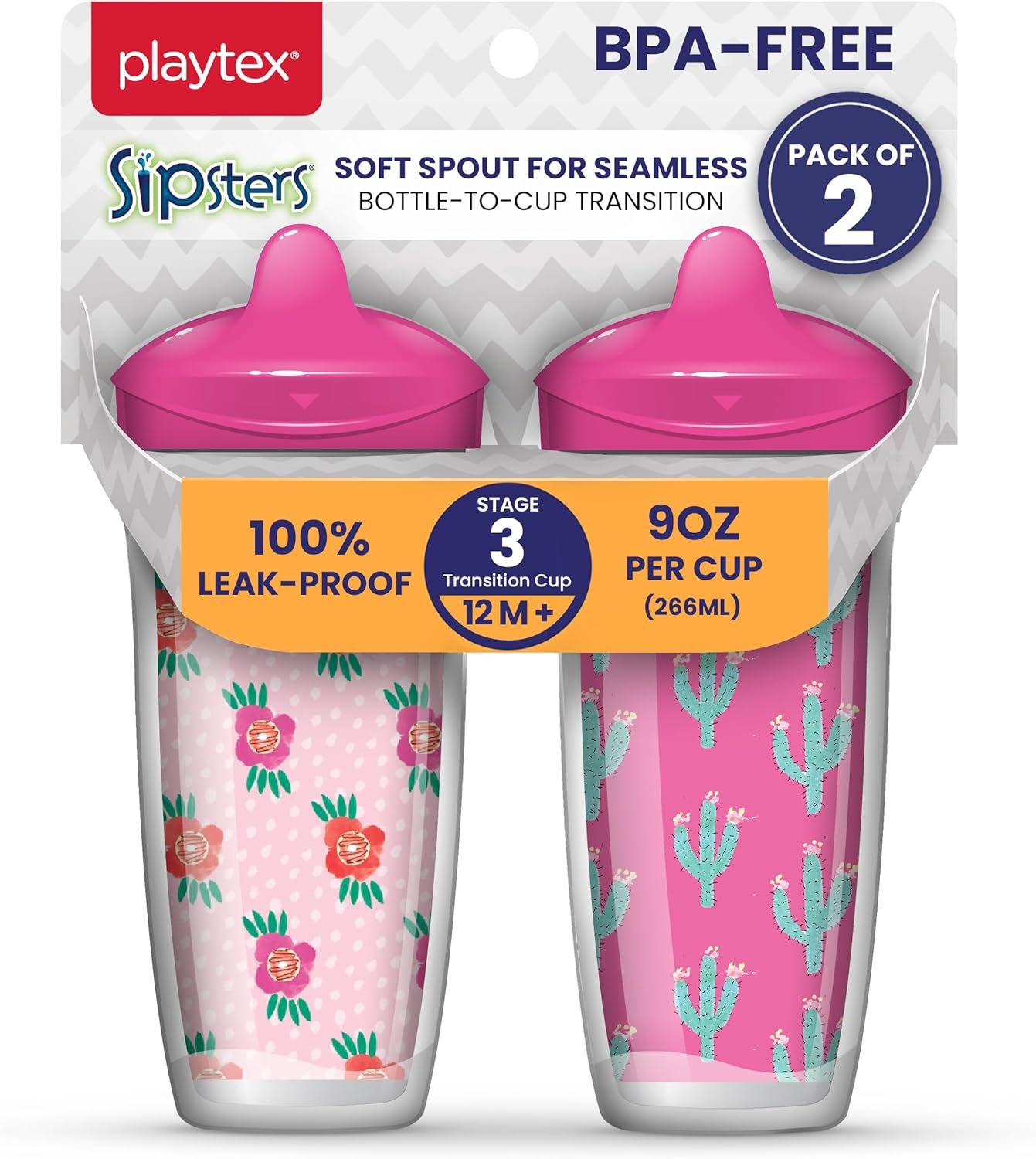 Playtex Baby Sipsters Hard Spout Sippy Cup for 12+ Months, 9 Ounce (2 Count), Pink Rose & Cactus Design, Insulated Toddler Water Bottle for Kids, Spill-Proof Cups for Toddlers 1-3, Stage 3