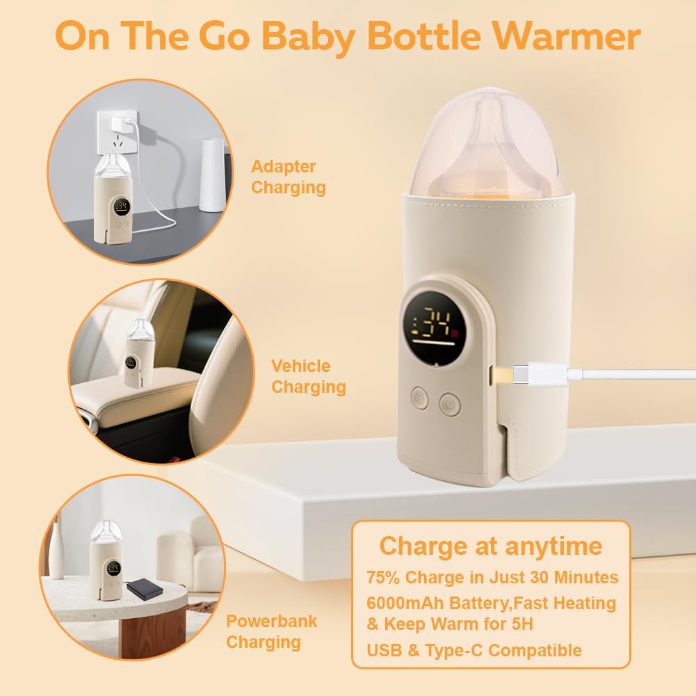 Friendly Reminder: Before first use, please fully charge the device twice consecutively!!!【Portable Bottle Warmer】Equipped with an 6000mAh battery, the car bottle warmer is designed to heat your baby’s bottle in 15 minutes and stay warm for up to 5-7hours when fully charged.keeping baby milk warm anytime. Please do not heat cold milk from refrigerator. Lightweight design, ideal for parents on a trip or on the go.