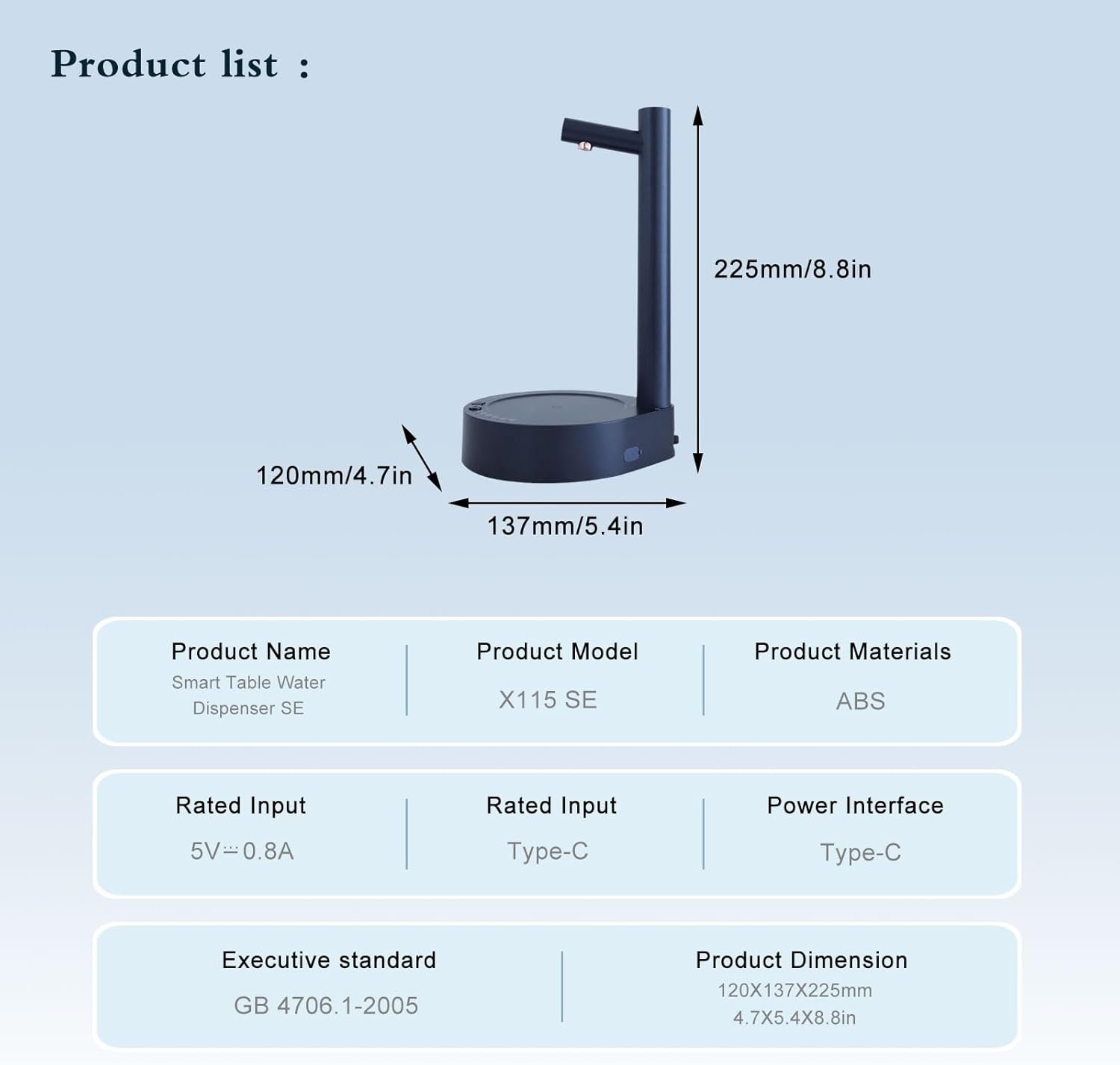 Product Name: Smart Table Water Dispenser SE Product Model: X115 SE Product Materials: ABS Rated input: 5V – 0.8A Rated input: Type-C Power interface: Type-C Executive standard: GB 4706.1-2005 Product Dimension: 120X137X225mm