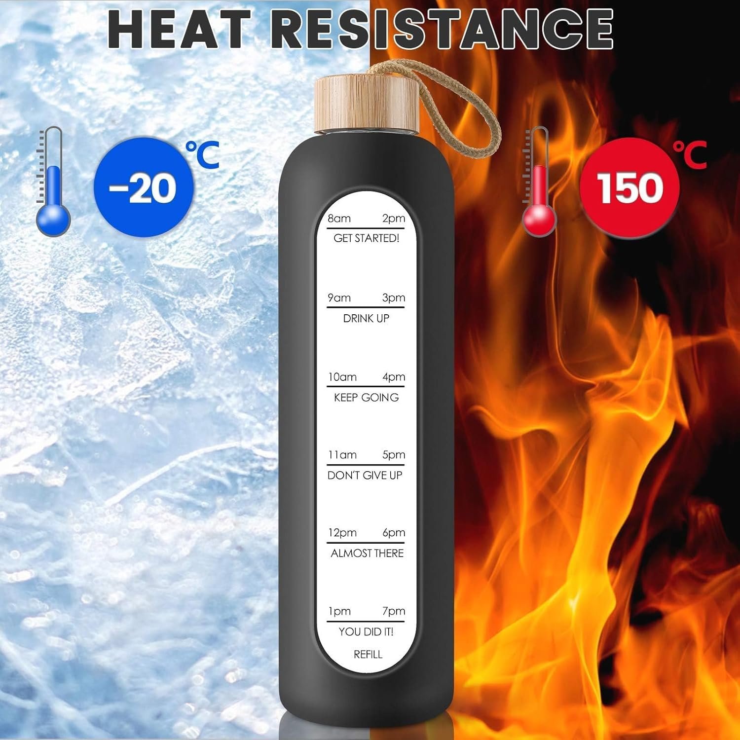 Durable and Leak Proof :Our leak proof and reusable cute water bottle glass with hourly markings is made of borosilicate glass which is BPA, BPS, PVC, Lead, and Cadmium free; This durable glass drinking bottle will not crack under extreme temperature and pressure