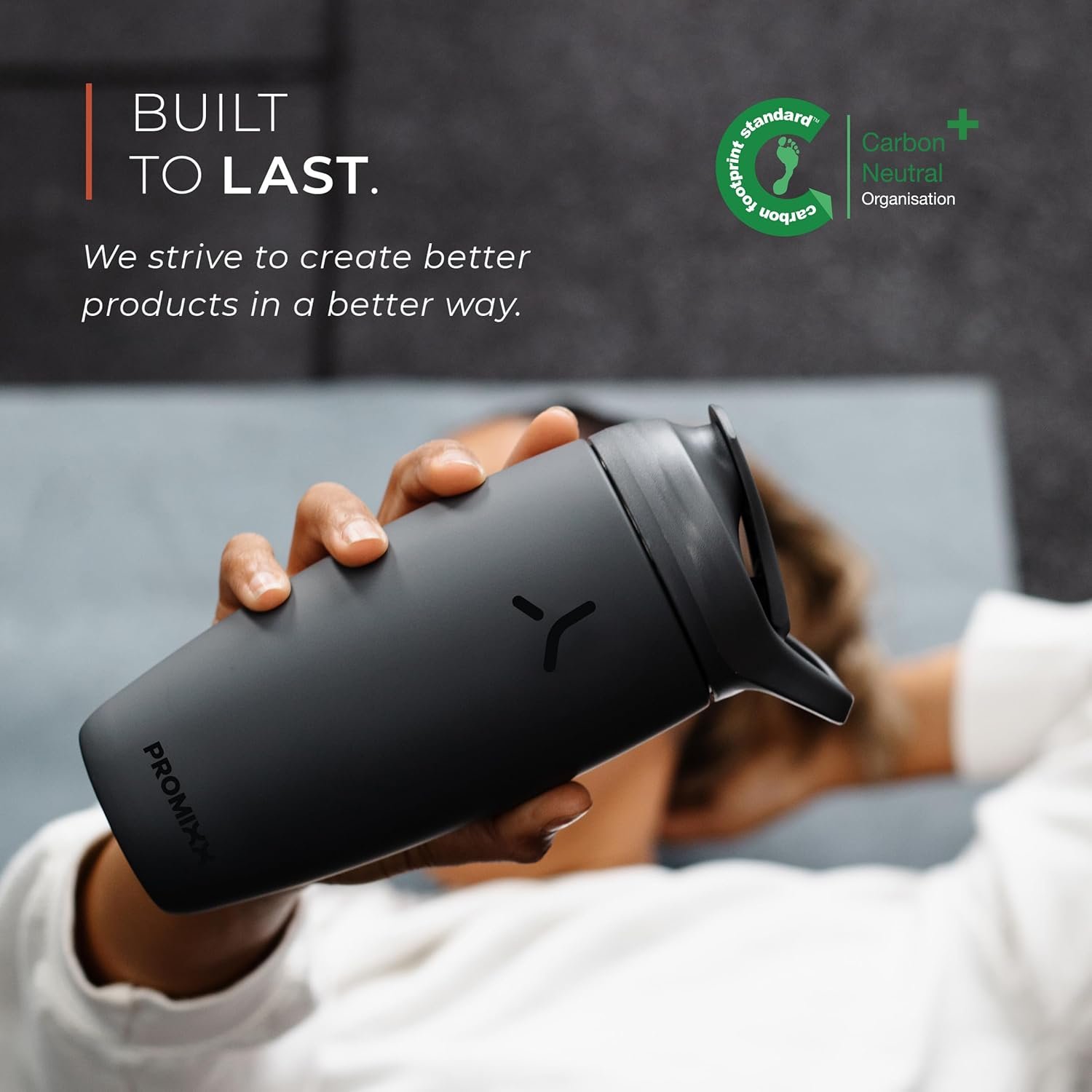 The Pursuit Stainless Steel Shaker Bottle by PROMiXX has been designed with sustainability, functionality and elegance in mind. The removable agitator means no rattling ball and no mess for a perfect mix. The vacuum-insulated bottle ensures your protein shakes are perfectly chilled!