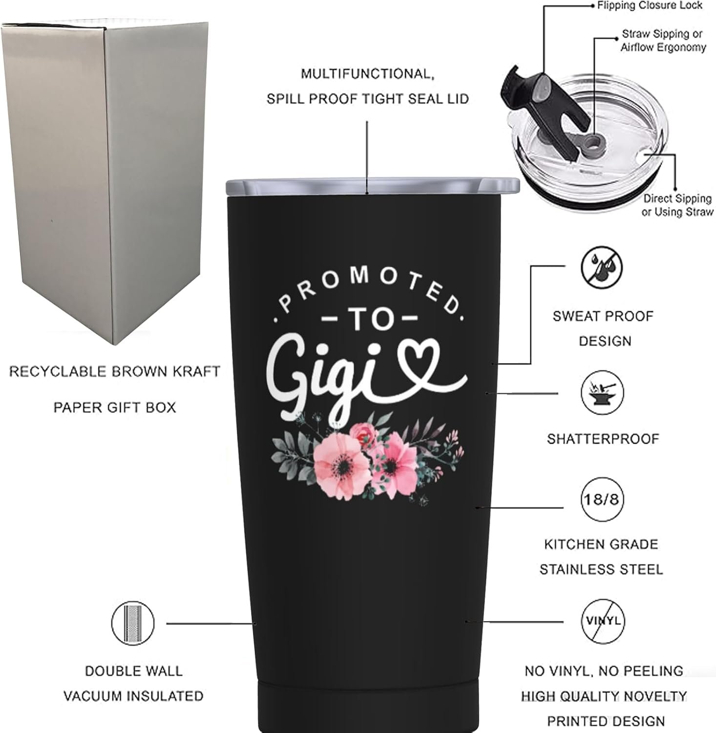 Promoted To Gigi 20 OZ Vacuum Insulated Tumbler with Leak-Proof Lid – Funny Gift for Grandma, Nana, Mimi, Grammy, New Grandma to Be – Birthday, Mothers Day, Christmas
