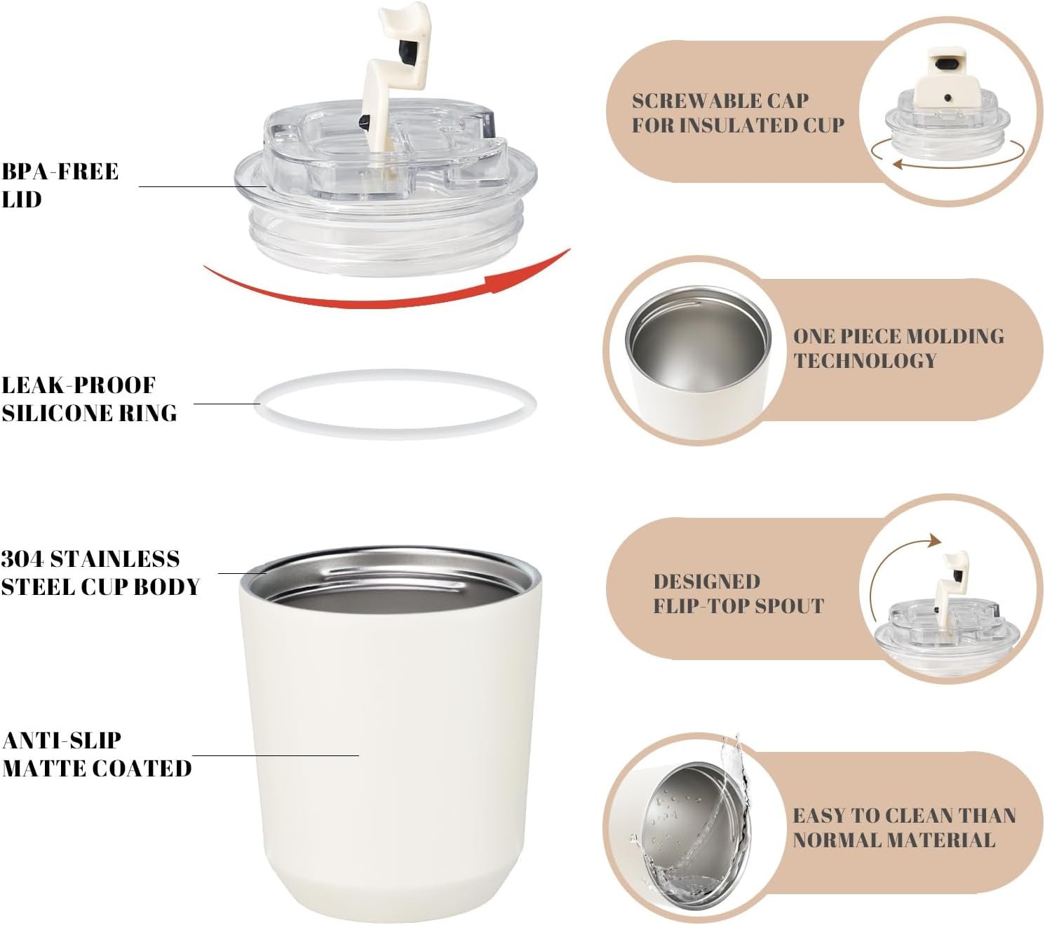 Leak-Proof Flip Lid: The tight-fitting flip lid design offers superior leak-proof functionality compared to other open designs. The lid, equipped with a silicone ring, securely fastens to the cup by twisting, eliminating liquid spills more effectively than traditional press-on lids
