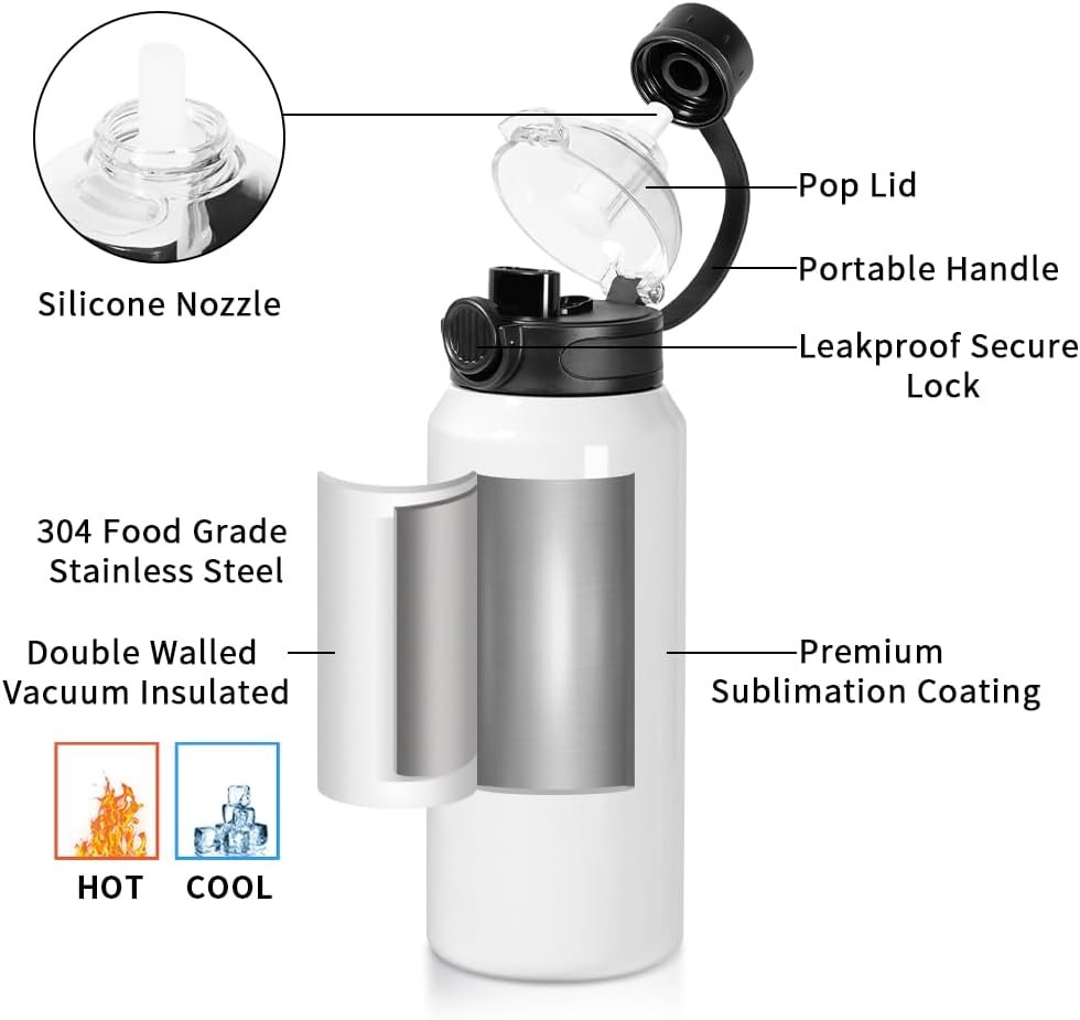 Premium Sublimation Water Bottles – Made of 18/8 304 food-grade stainless steel,which can keep the drinks hot or cold for hours. These 32 oz sublimation blanks feature a professional-grade sublimation coating that delivers bright, vivid, and fade-resistant prints.