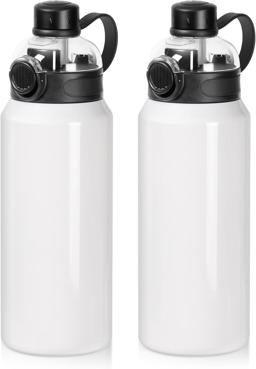 PYD Life 2 Pack Sublimation Sports Insulated Water Bottle Blanks 32 OZ / 900 ML Vacuum Flask Jug Tumblers with Straw Spout Pop Lid and Silicone Handle for Gym,Hiking,Outdoors