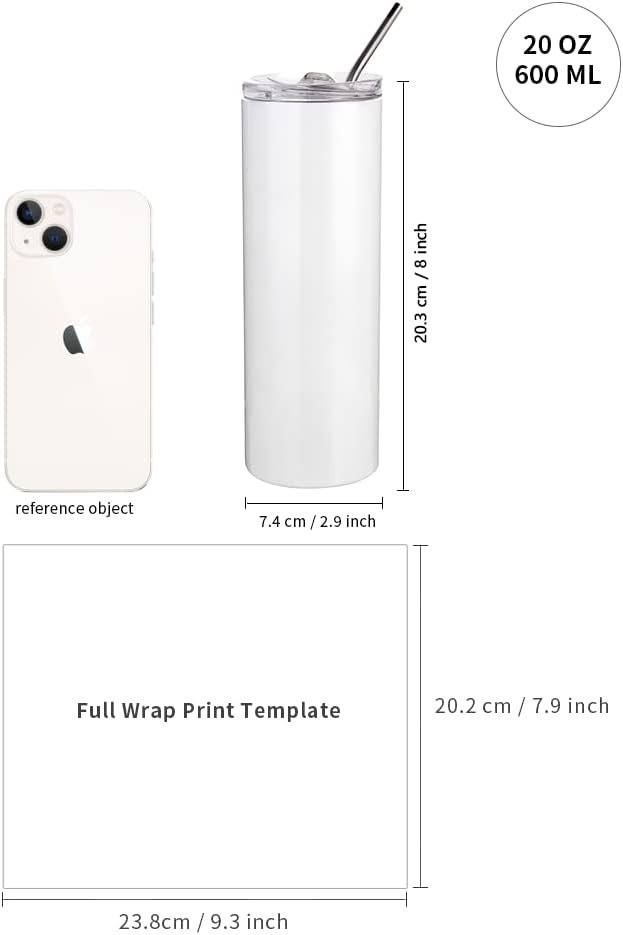 Specification:20 OZ 600 ML,each sublimation skinny tumbler with individual box,each skinny tumbler with slide lid and metal straw.It come with 10 pieces shrink wrap film,the ideal tool for full wrap print by sublimation oven.8 pieces packing with one big brown box.