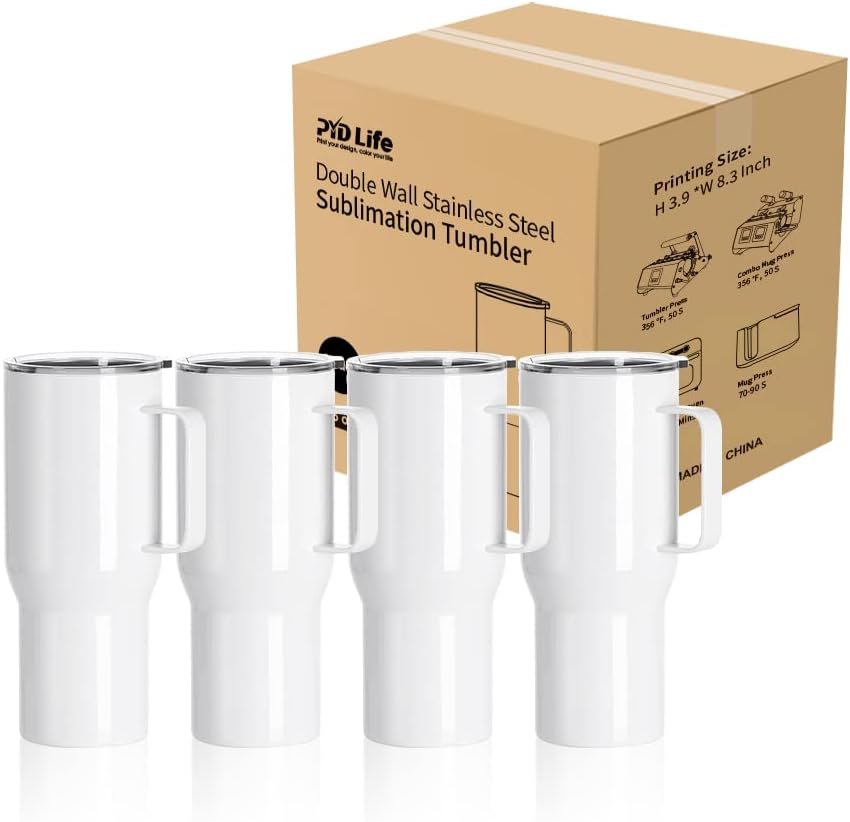 PYD Life Sublimation Tumblers Blanks with Handle 25 OZ Coffee Travel Car Stainless Steel Mugs Cups with Leakproof Lid for Mug Tumbler Heat Press Sublimation Oven Printing 4 Pack