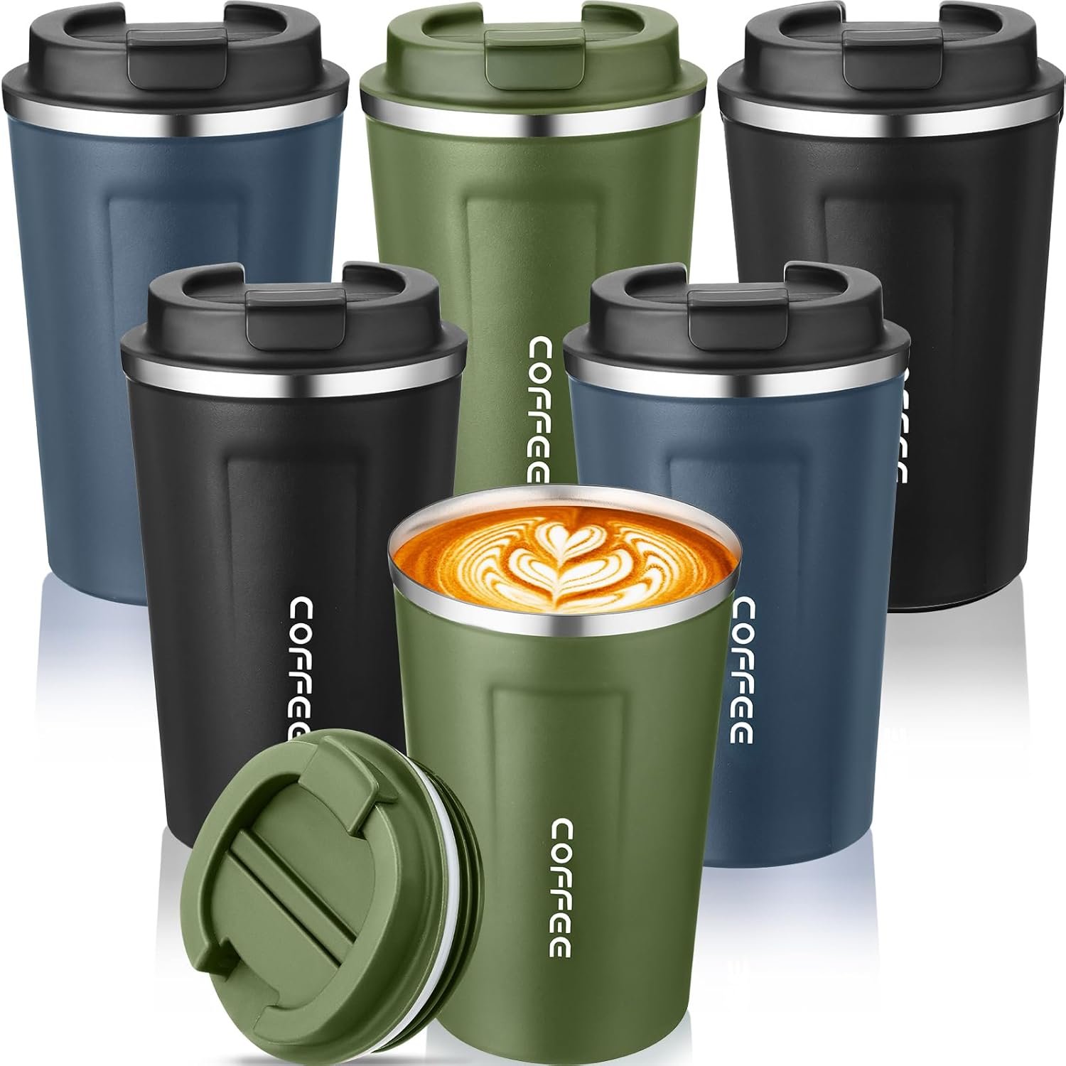 Qinyoung 6 Pack Travel Coffee Mugs 12oz Double Wall Insulated Coffee Cups Bulk with Lid Vacuum Stainless Steel Leak Proof Reusable Portable Tumblers for Cold and Hot Drinks(Black, Blue, Green)